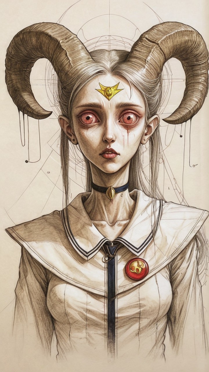 Prompt: [[Orwellian Kafkaesque Metamorphosis, Damascus Goat Sailor Moon Uniform Diablo III Game, Ocular Math Art Spectral Insomnia of Zdzisław Beksiński ((( mind from mindlessness and thoughts from chaos of synthetic machinarium god of naive art brut))) gomu gomu no mi xenomorphic second jaw downright traumatic Rugrats, full body, unpredictable, oppressively frightening impressionism {It's Natural to Be Afraid of Mushroomhead? : Kandinsky_Rothko by messy outsider art style as by Jean Giraud, Eric Brenner art}]]