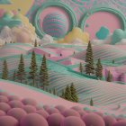 A surreal landscape features vibrant swirls of pink, blue, and green hues, with rolling hills and unique trees. Ethereal colors create a dreamlike atmosphere under a large, glowing orb.
