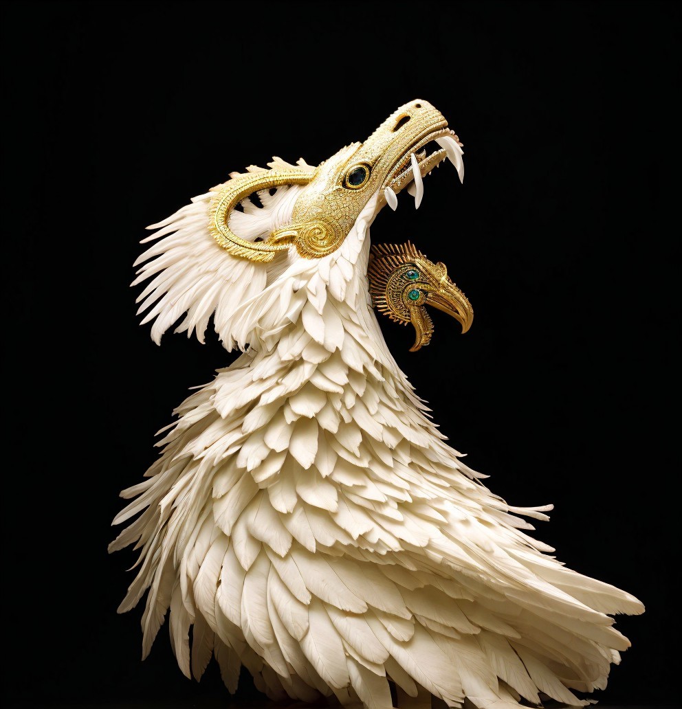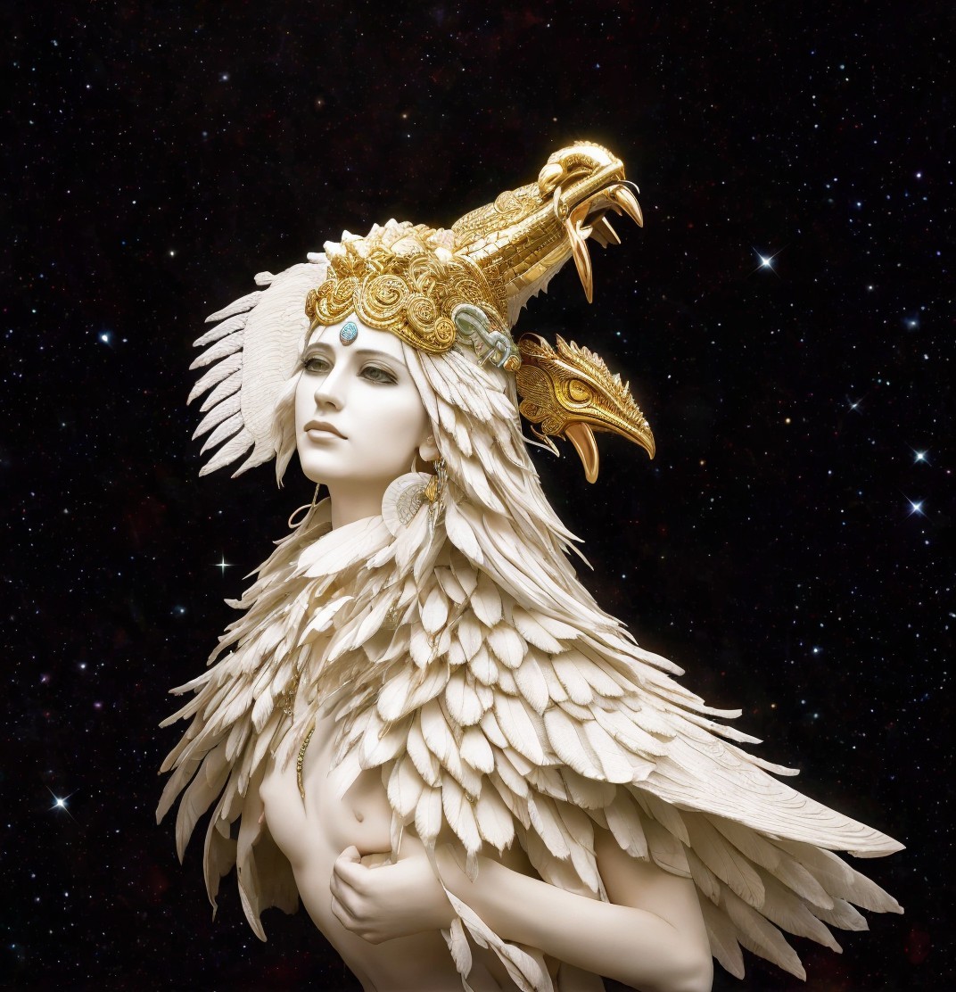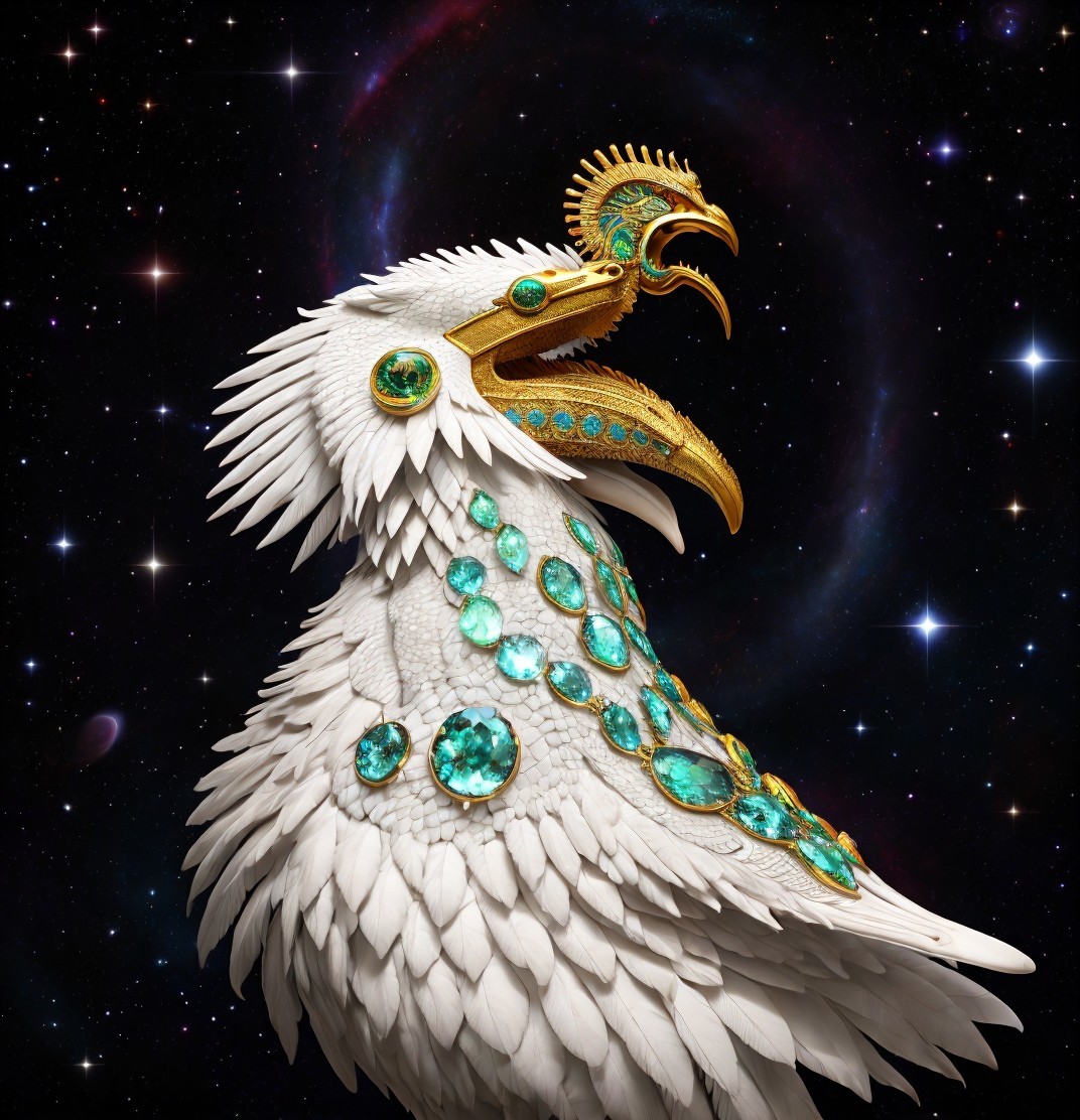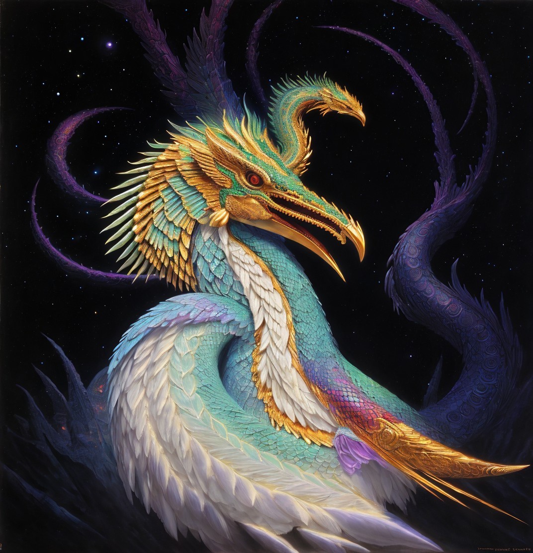 Golden-scaled dragon with peacock feathers in cosmic scene.