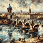 Painting of a bridge in France, with thick and heavy brush blows and a mixture of ink washing, capturing the textured and fluid style