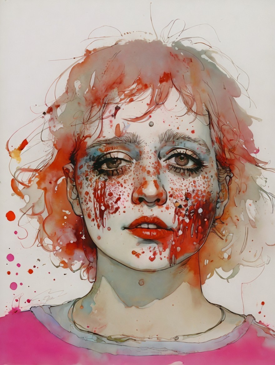 A vivid watercolor portrait of a woman with splashes and drips of red and orange, giving a sense of abstract emotion or creativity.