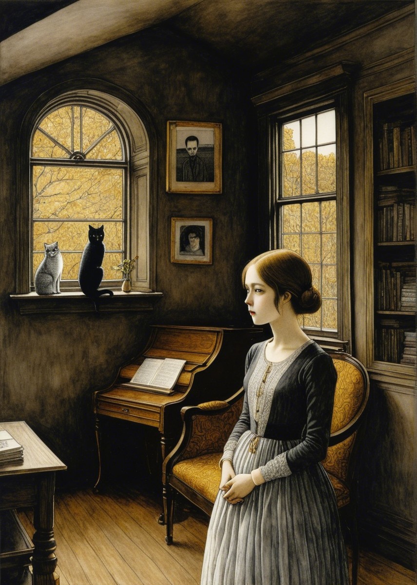The artwork features a somber man with a beard and a woman with long hair, both dressed in dark, elegant attire. They stand amidst stylized trees with golden leaves, creating a mysterious atmosphere.