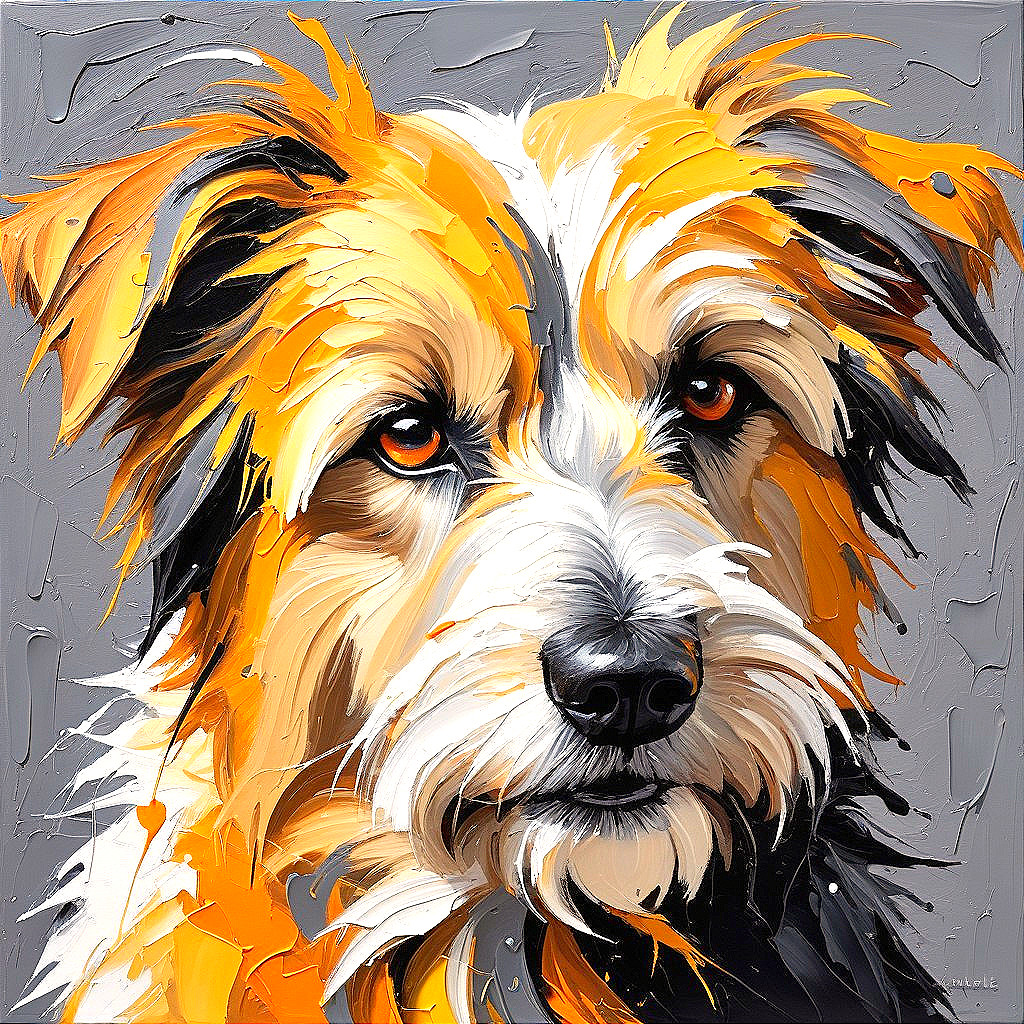A vibrant, textured painting of a dog's face, showcasing bold brushstrokes in shades of orange and white against a gray background, capturing the animal's expressive eyes and fluffy fur.