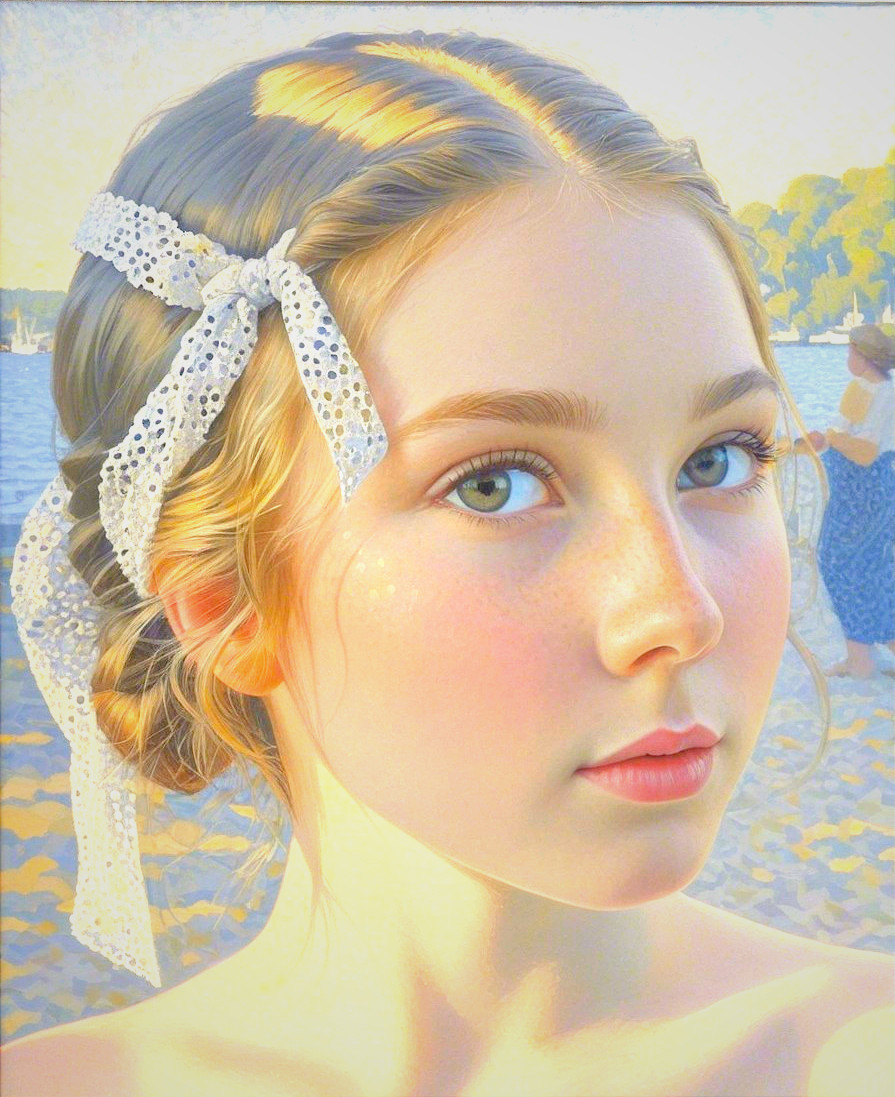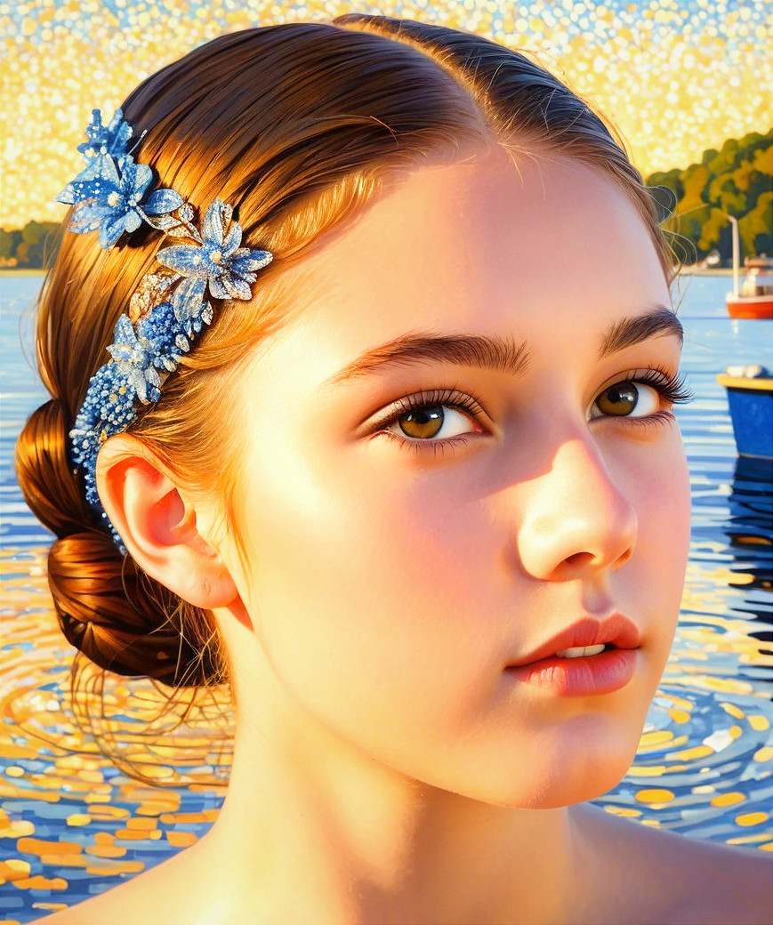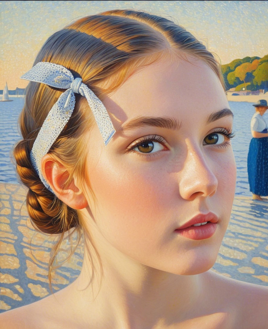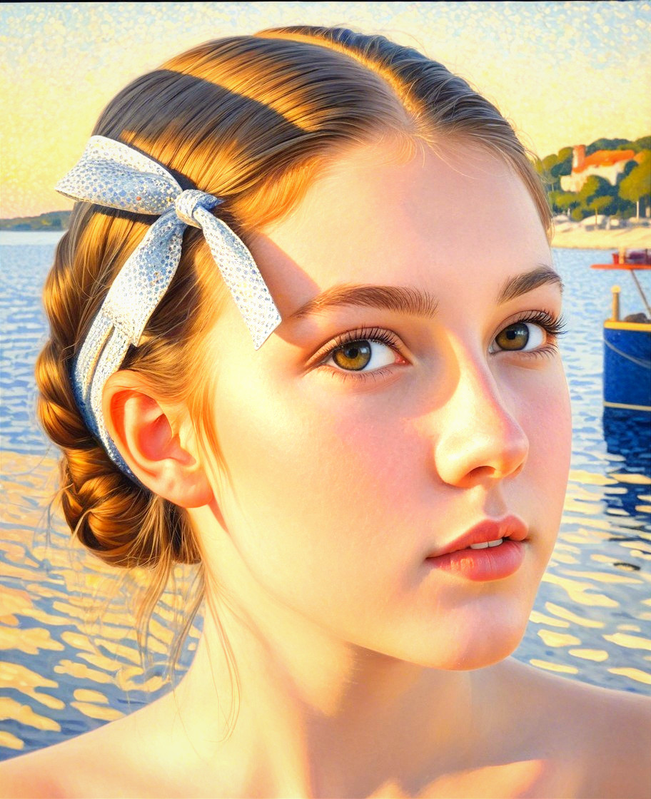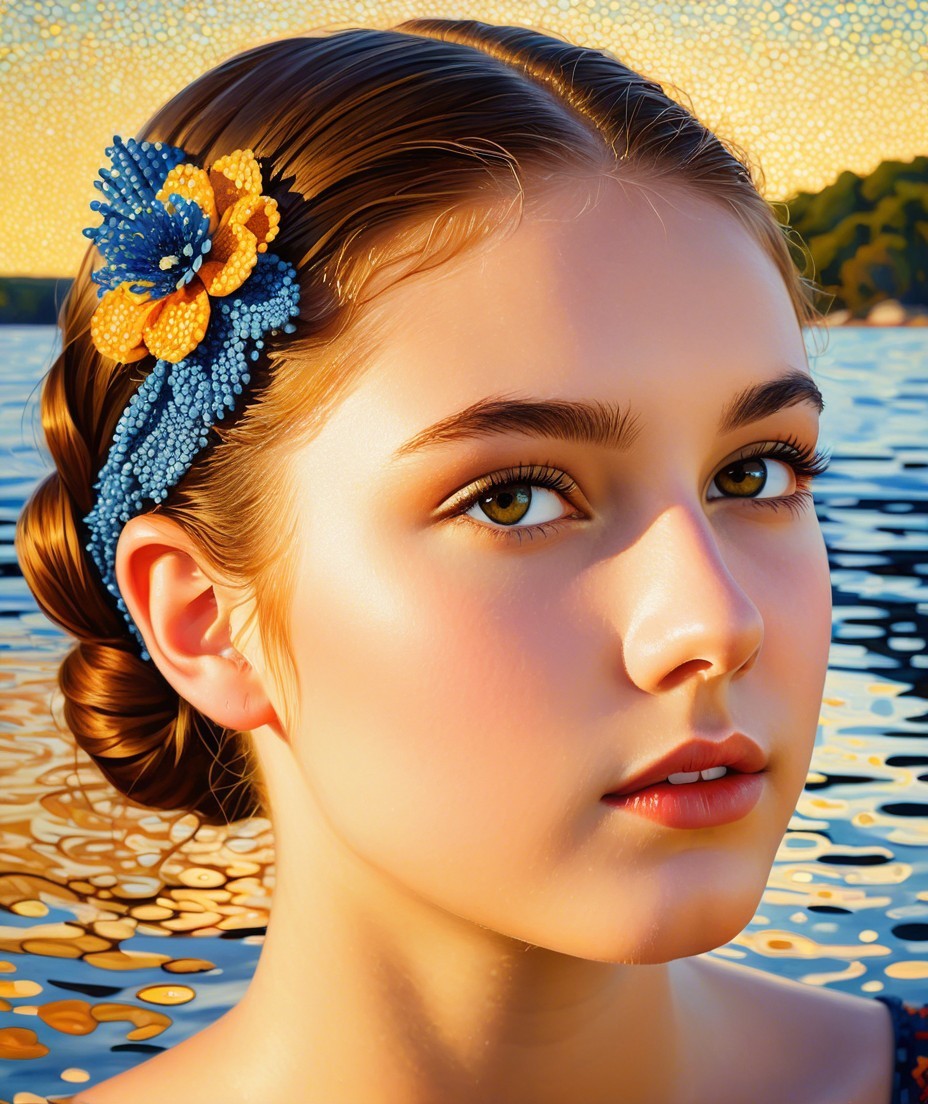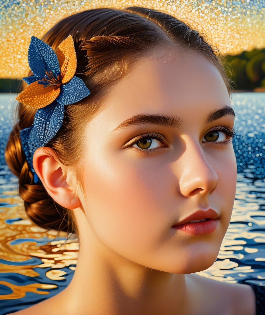 Portrait with intricate Moiree effect on water surface. Dynamic lighting, high coloring, warm toned hues. Juvenile teenage enchantress. Incorporating the intricate styles of Paul Signac and Seurat, color palette inspired by Brad Kunkle, pointillism masterpiece, dramatic lighting contrasts, inspired by the styles of Devin Allen, Gabriel Pacheco, Isabelle Arsenault, Man Ray, hues by Overton Loyd, intricate details, pastel tones in an orphism-inspired color scheme, blotting, dynamic lighting, irregular strokes and squiggly lines for a harsh touch, dyed art with parallax occlusion and subsurface scattering, plasticity 1.3, subsurface scattering of 1.7, enhancing the art with dyed effects and a simplistic color scheme, blotting ink portrait with a tessellated design, featuring line-art details and a touch of sweatiness, stippled, tesselated, blotted, unique, subsurface scattering 1.5, precise Gelsculpt technology at 64k resolution for 3D effects, with UHD and HDR quality, and VFX-inspired elements, bright splashing watercolors, intricate alcohol ink effects, whimsical oversprays of painture, stylized, stippled look with tesselated patterns, warm tones, complex interplay of light and shadow, diffused light, warm tones,lean and tall details, warm and rich color palette with earthy tones, layered textures, fragmented elements, painterly style with bold brushstrokes by Brandon Mably and William Bradley, hand-drawn illustration style, irregular strokes, sketchy, simplistic lorphism reminiscence, blotting, dyed, very intricate, complex line-art features, resin, oil, wax, brightness of 1.3, complex yet diffused lighting setup. Opt for warm tones and a vintage feel, negative lucas numbers, LiDAR point cloud, reminiscent of the stylized rewildered essence of Susan Seddon Boulet's style, orphism, dof, debeh, bokeh, stippled, tesselated, blotting, squiggly line-art, intricate details, drawing inspiration from Man Ray's color palette,