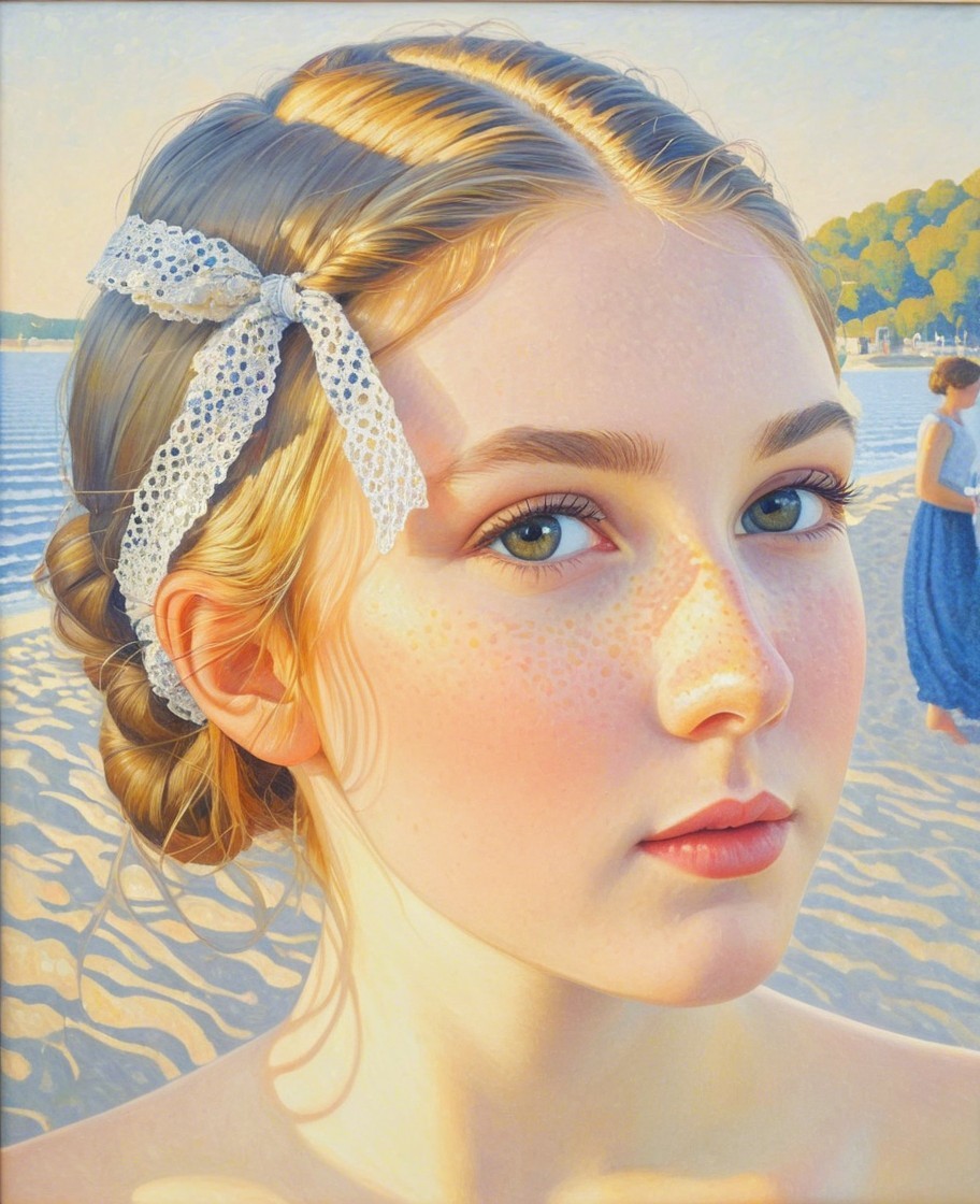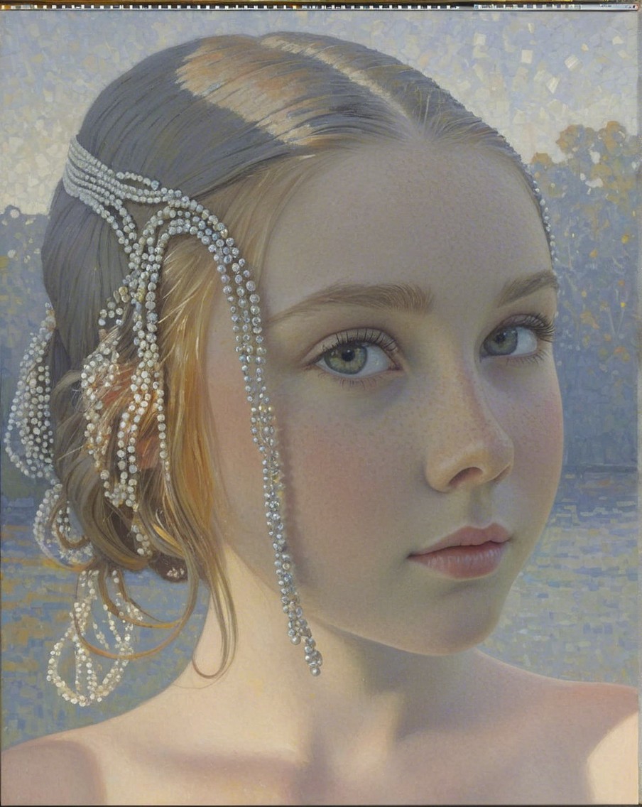 Prompt: Portrait with intricate Moiree effect on water surface. Dynamic lighting, high coloring, warm toned hues. Juvenile teenage enchantress. Incorporating the intricate styles of Paul Signac and Seurat, color palette inspired by Brad Kunkle, pointillism masterpiece, dramatic lighting contrasts, inspired by the styles of Devin Allen, Gabriel Pacheco, Isabelle Arsenault, Man Ray, hues by Overton Loyd, intricate details, pastel tones in an orphism-inspired color scheme, blotting, dynamic lighting, irregular strokes and squiggly lines for a harsh touch, dyed art with parallax occlusion and subsurface scattering, plasticity 1.3, subsurface scattering of 1.7, enhancing the art with dyed effects and a simplistic color scheme, blotting ink portrait with a tessellated design, featuring line-art details and a touch of sweatiness, stippled, tesselated, blotted, unique, subsurface scattering 1.5, precise Gelsculpt technology at 64k resolution for 3D effects, with UHD and HDR quality, and VFX-inspired elements, bright splashing watercolors, intricate alcohol ink effects, whimsical oversprays of painture, stylized, stippled look with tesselated patterns, warm tones, complex interplay of light and shadow, diffused light, warm tones,lean and tall details, warm and rich color palette with earthy tones, layered textures, fragmented elements, painterly style with bold brushstrokes by Brandon Mably and William Bradley, hand-drawn illustration style, irregular strokes, sketchy, simplistic lorphism reminiscence, blotting, dyed, very intricate, complex line-art features, resin, oil, wax, brightness of 1.3, complex yet diffused lighting setup. Opt for warm tones and a vintage feel, negative lucas numbers, LiDAR point cloud, reminiscent of the stylized rewildered essence of Susan Seddon Boulet's style, orphism, dof, debeh, bokeh, stippled, tesselated, blotting, squiggly line-art, intricate details, drawing inspiration from Man Ray's color palette,