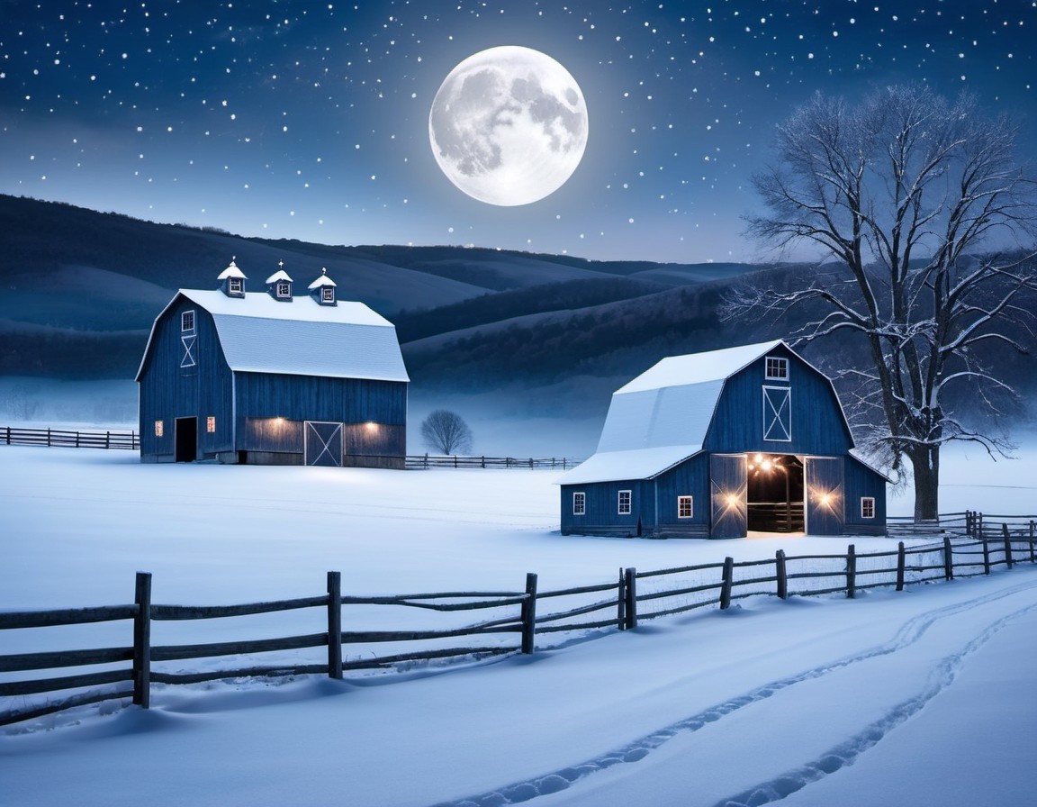 Add a decorated lit christmas tree, and christmas lights around barn. Beautiful winter scene of a weathered blue barn on a farm, with rolling hills in the background.lots of snow falling. It is evening and the moon is bright. pretty christmas lights are wrapped around the barn as well as Christmas tree and decor. A magical Christmas scene in blue white and black hues