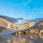 A surreal landscape features flowing, wave-like structures in vibrant colors, blending with a serene beach and distant mountains under a starry sky at sunset, radiating a dreamlike atmosphere.