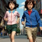 Two kids are running joyfully down a sunny street lined with buildings and a large tree. The girl is in a pink shirt and shorts, while the boy wears glasses and a blue jacket, both smiling.