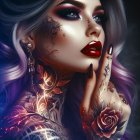 A close-up portrait of a glamorous person with striking makeup, featuring bold purple lips, shimmering eye shadow, and vibrant hair dyed in shades of silver and lavender, set against a sparkling backdrop.