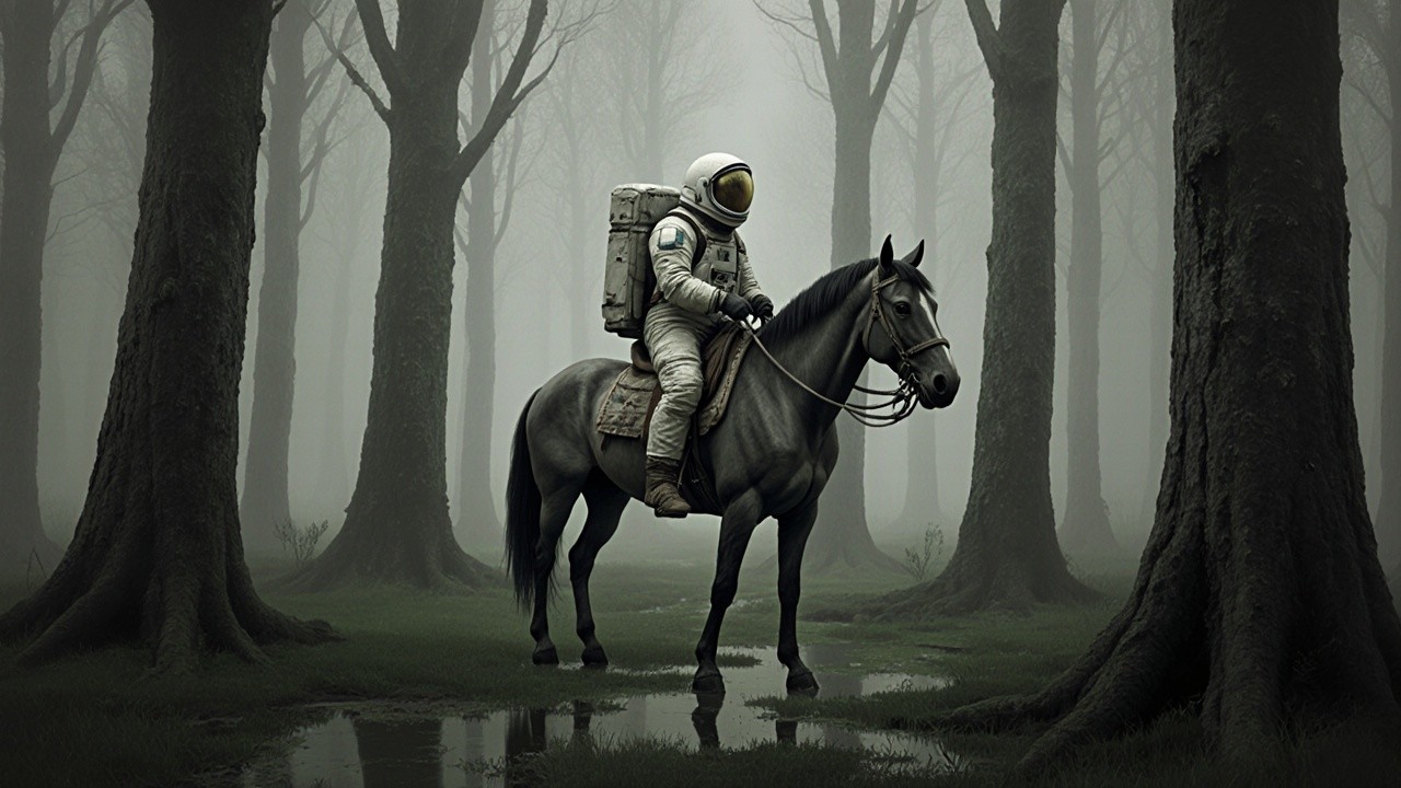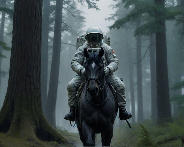 An astronaut in a silver space suit rides a horse through a foggy forest, surrounded by tall trees. The scene is atmospheric, blending elements of nature and space exploration.