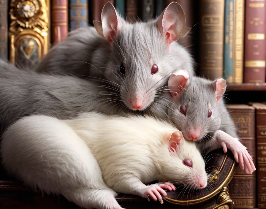 Four white rats cuddle together on a vintage chair with ornate detailing, set against a backdrop of classic books.