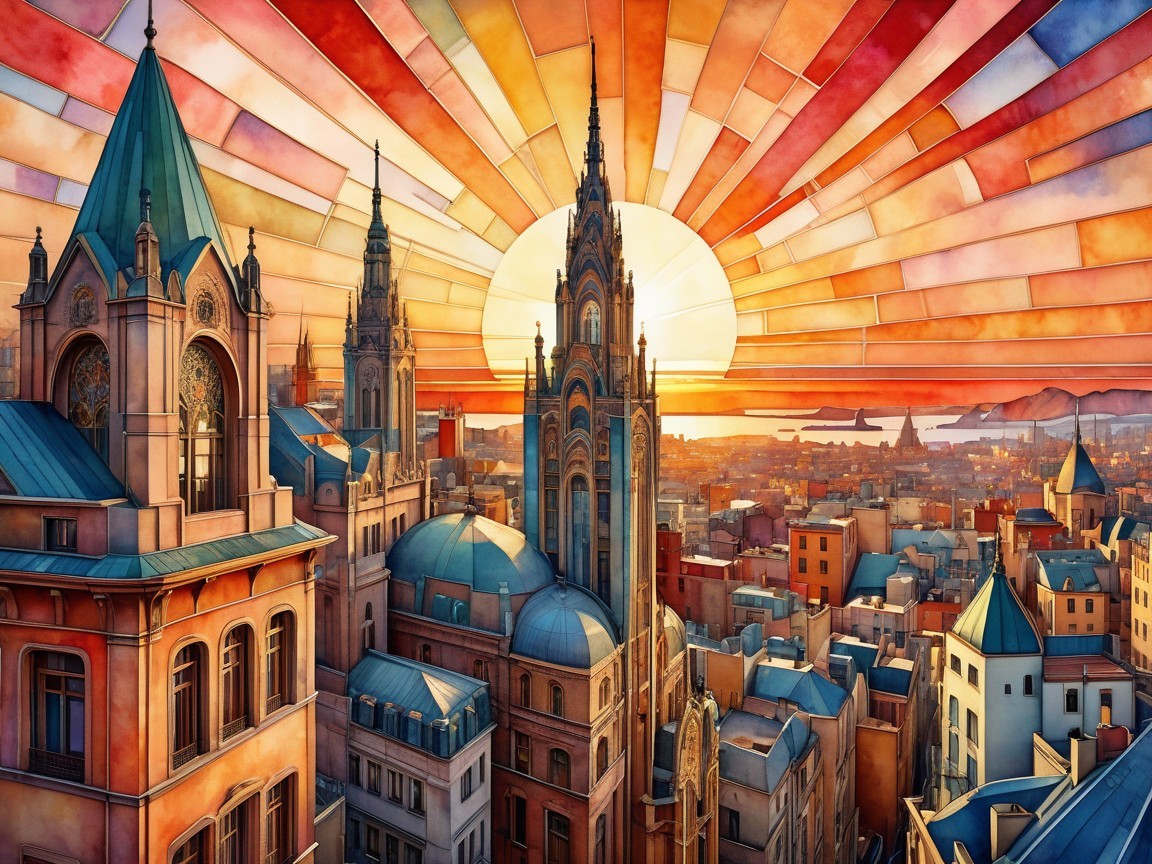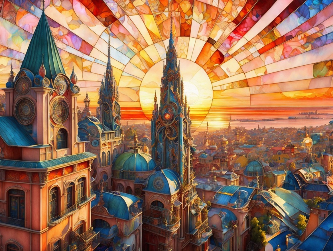 A stunning cityscape at sunset, featuring ornate buildings with intricate architecture and vibrant stained glass. Warm colors fill the sky, illuminating the landscape and tranquil waters below.
