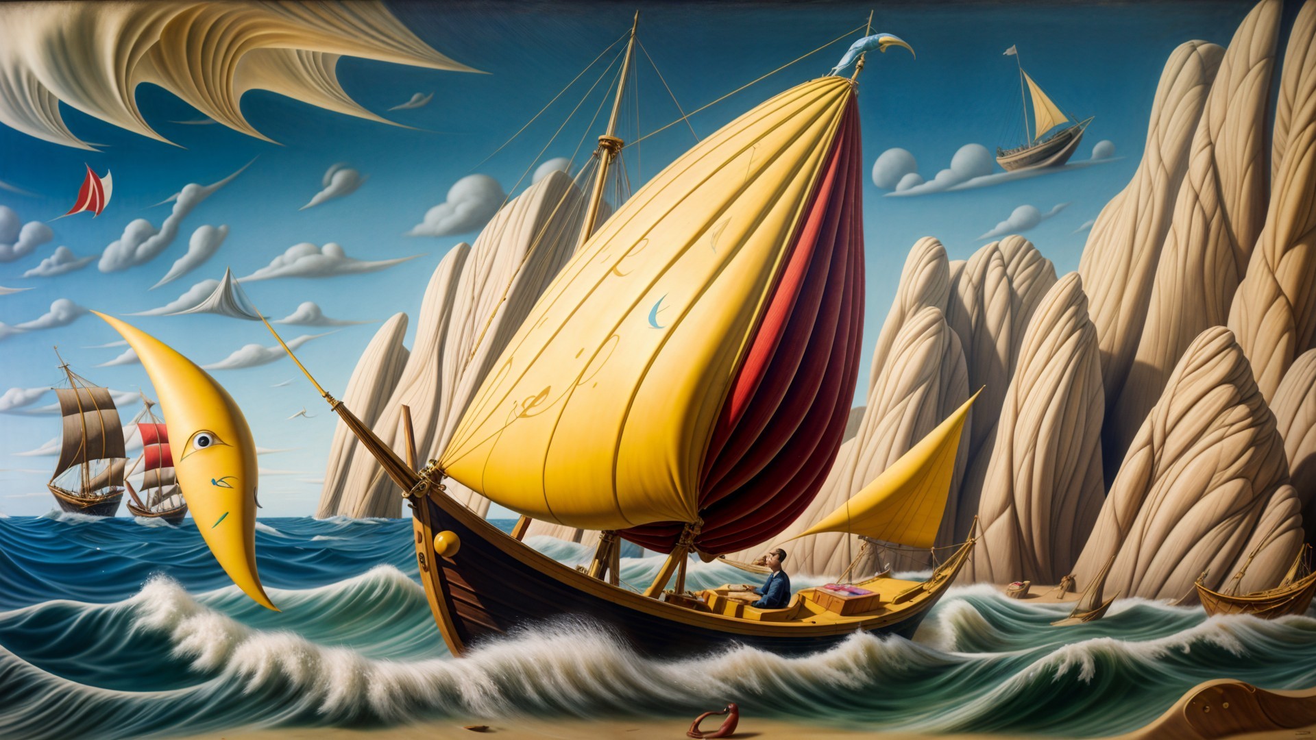 A vibrant scene of sailing ships with colorful sails navigates turbulent waters, surrounded by dramatic cliffs and a lively sky filled with birds and fluttering sails.