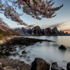 A serene landscape featuring cherry blossom trees in full bloom, framing a calm body of water. Rocky shores and distant mountains create a peaceful, picturesque scene at sunset.