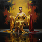 A woman elegantly poses in a flowing mustard dress that transitions to black, holding a paintbrush beside a cracked wall. Below her, vibrant paint pools on the floor, creating an artistic scene.