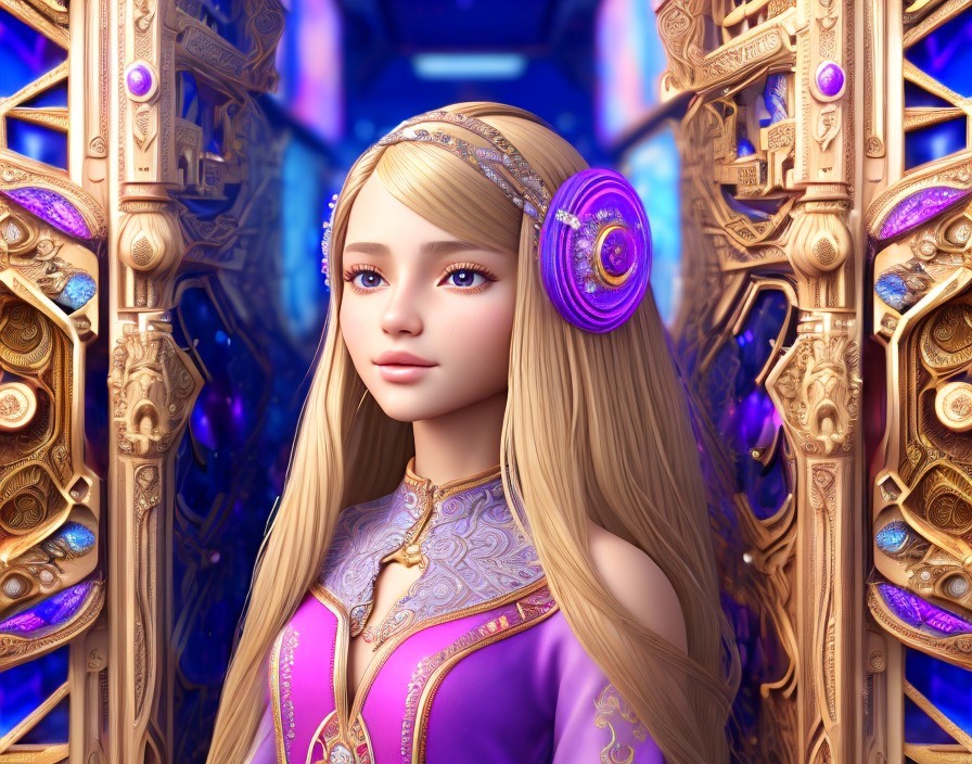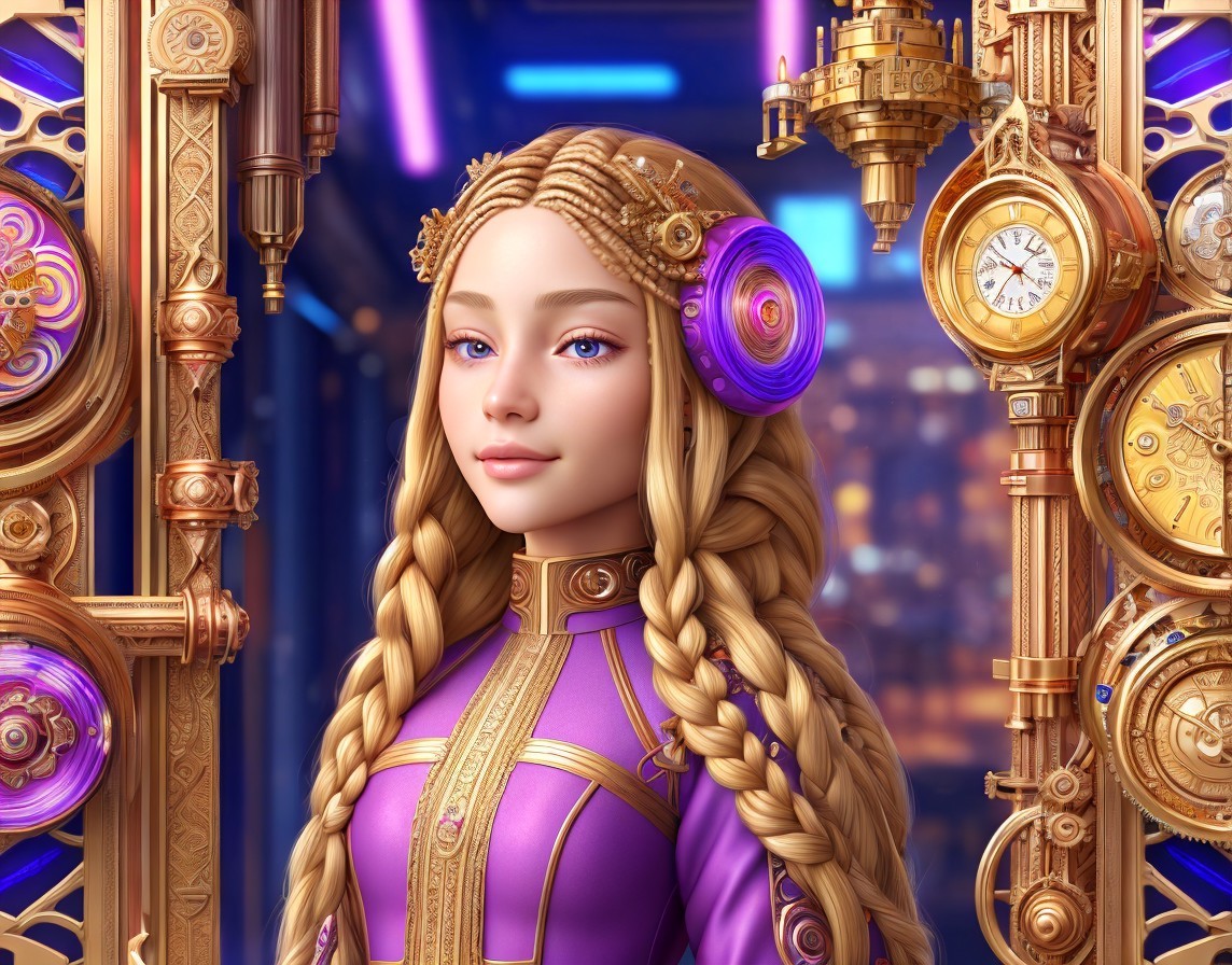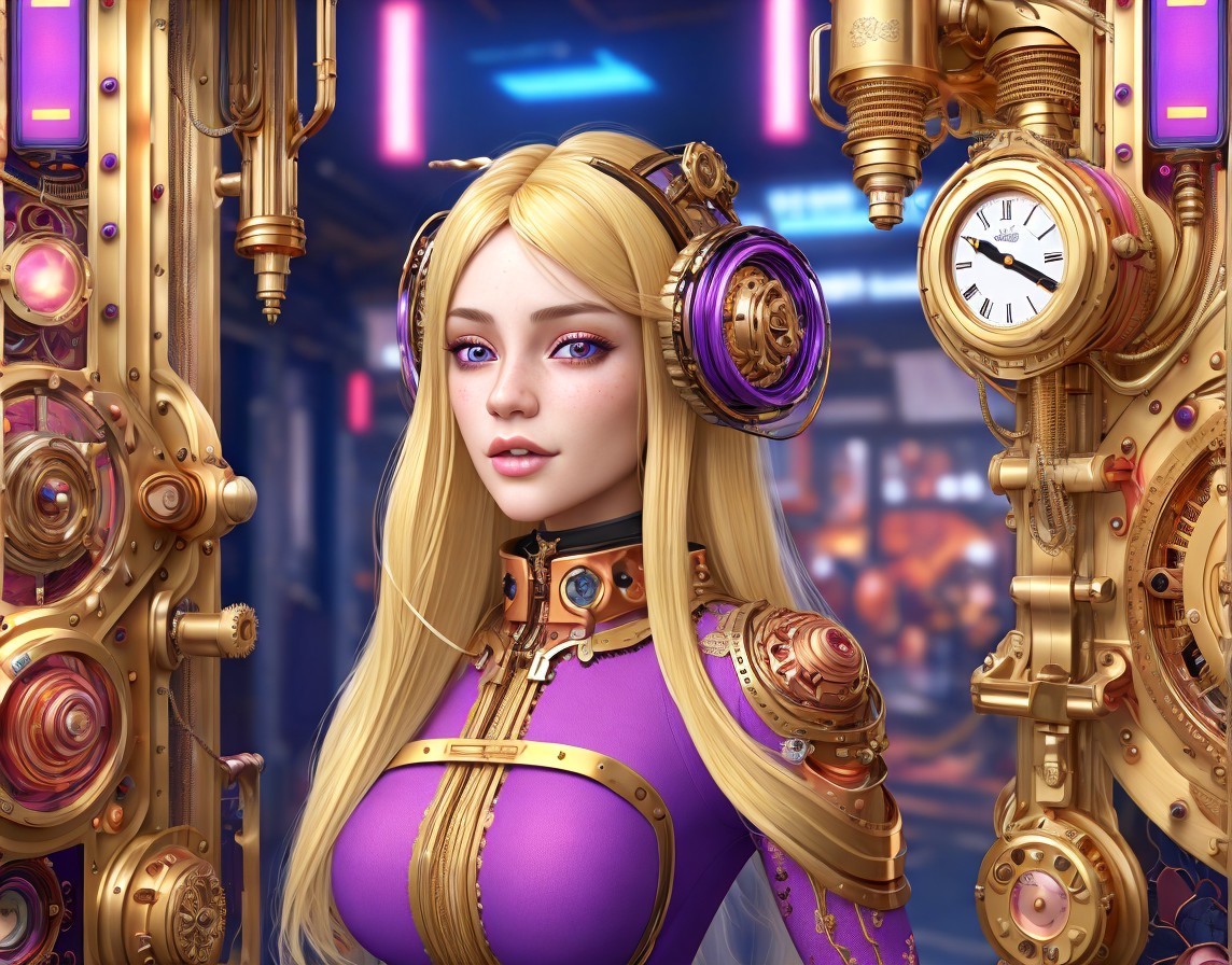 Lavish 3d, extremely detailed, fabric corridor with metallic copper and brass accents, boilers, clocks, gears, teen woman in blouse with blonde hair, intricate color, intricate technical details, vibrant colors, triadic color scheme purple chromium silver, cyberpunk style, cyberpunk ornamental details, mechanical fittings, plasticity, realistic humanoid in a half-body portrait, blending science fiction art and tints of surrealism, intricate composition, chiaroscuro lighting, ethereal essence, ultra-realistic, digital painting, 3D conceptual art, highly detailed strokes