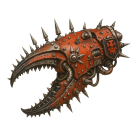 The image features a striking, mechanical skull with sharp spikes and intricate metallic details. Its vibrant red color, combined with menacing fangs and a fierce design, evokes a surreal, sci-fi creature.