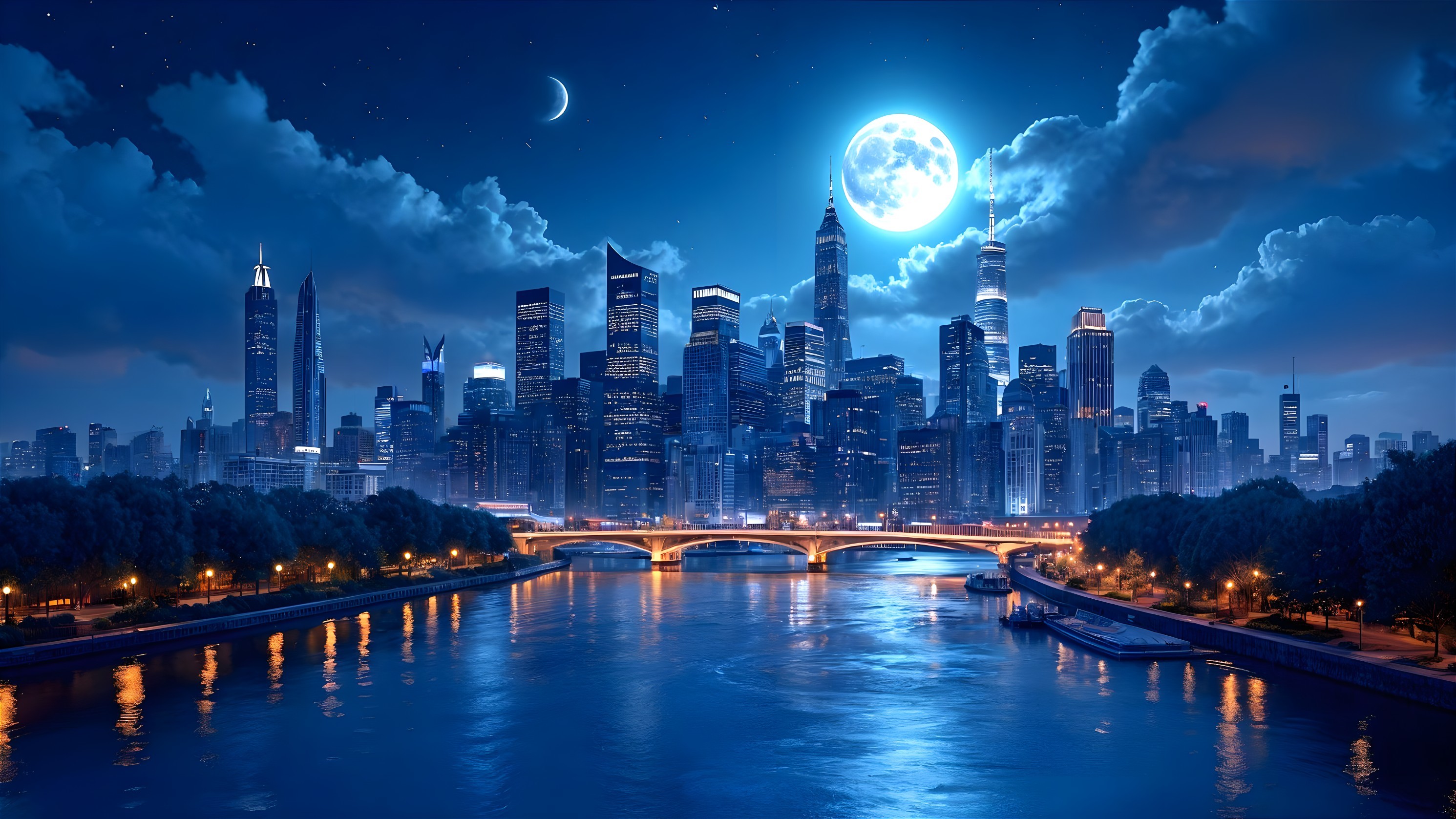A stunning digital painting captures a city skyline under moonlight, showcasing illuminated skyscrapers and reflections on a river. The serene atmosphere is enhanced by twinkling lights and stars, creating a peaceful urban landscape.
