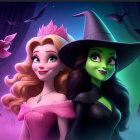 Two animated characters stand close together, one a princess in a pink gown with a crown, the other a witch with green skin in a black outfit. The background features vibrant colors and flying birds.