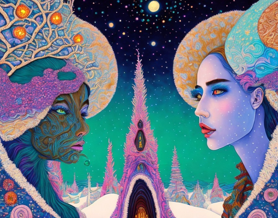 Vibrant stylized faces with elaborate headdresses on snowy night landscape