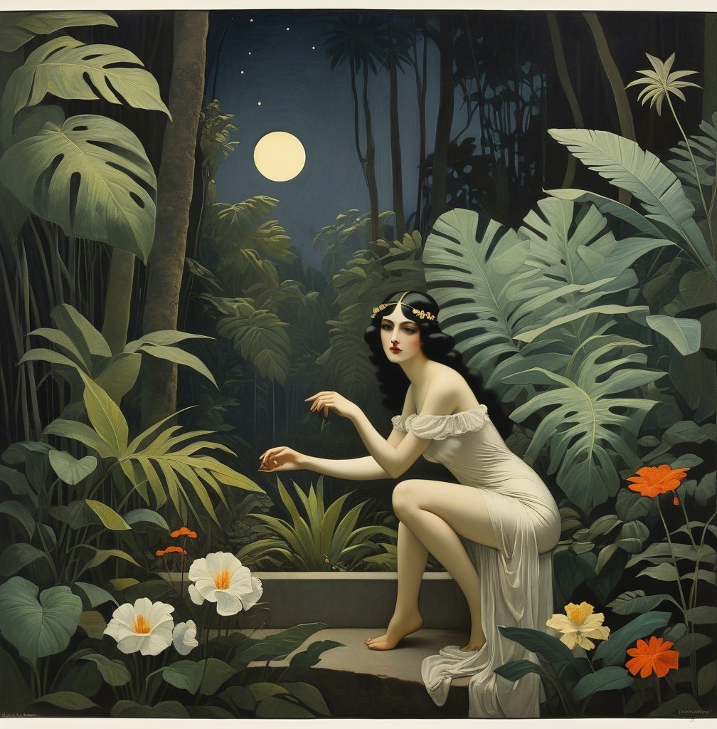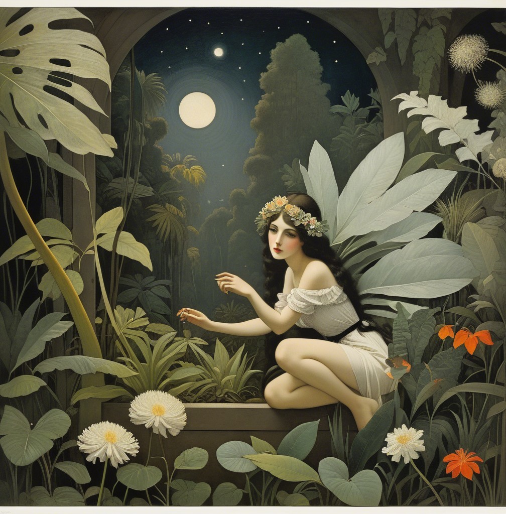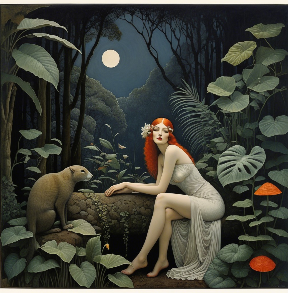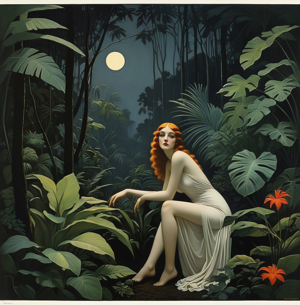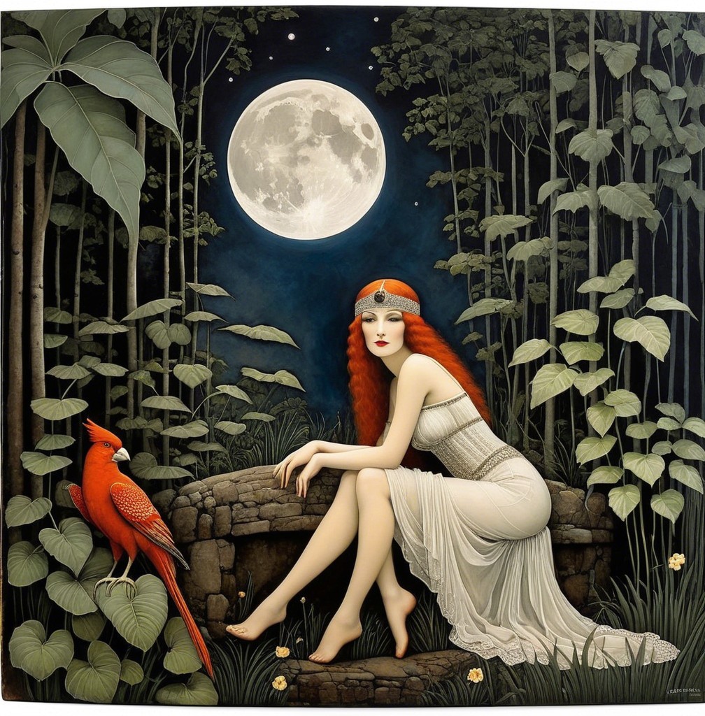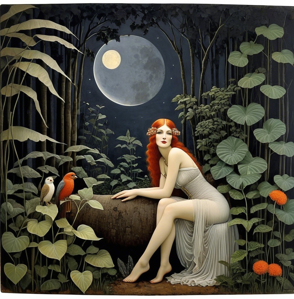 A mystical scene features a woman in a white dress with red hair, seated by a stone bench, surrounded by lush foliage and birds, illuminated by a full moon. Enchantment fills the atmosphere.