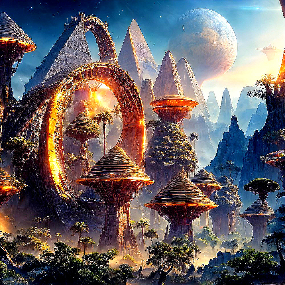A vibrant sci-fi landscape with futuristic structures, alien vegetation, and a large moon against a starlit sky.