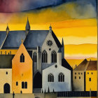 A stunning watercolor painting depicting a stylized cityscape at sunset. Gothic architecture features prominently, with rich shades of orange, blue, and violet blending in a dramatic sky.