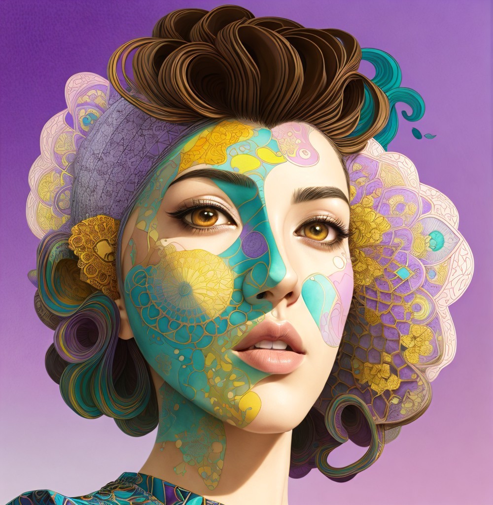 Visionary portrait, stylized woodblock print, watercolor and ink, stylized Hair in mandelbrot fibonacci style, contrasting colors, ink flow, Girih tiling in background, arabesque, ethereal, unique, plasticity 1.8, tetradic colour scheme grey purple teal ochre, perfect handsface, 3d effects 1.3, grey rim lighting from top to center, hues, style of Harrison fisher, Margaret Keane, Overton loyd, anisotropic filtering 1.4, hues, raytraced shadows, comical, hallucinatory, low key lighting, varnish, ethereal, American gothic 1.6, high coloring, abstract, synthetic, hdr, octane render, juvenile, beautiful composition 1.5,