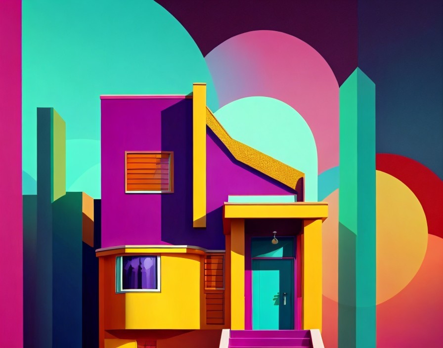Vibrant modern house illustration with colorful walls and abstract backdrop