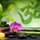 A serene arrangement featuring a candle, a pink rose, bamboo stalks, and smooth stones, all set against a softly blurred green background, evoking tranquility and natural beauty.