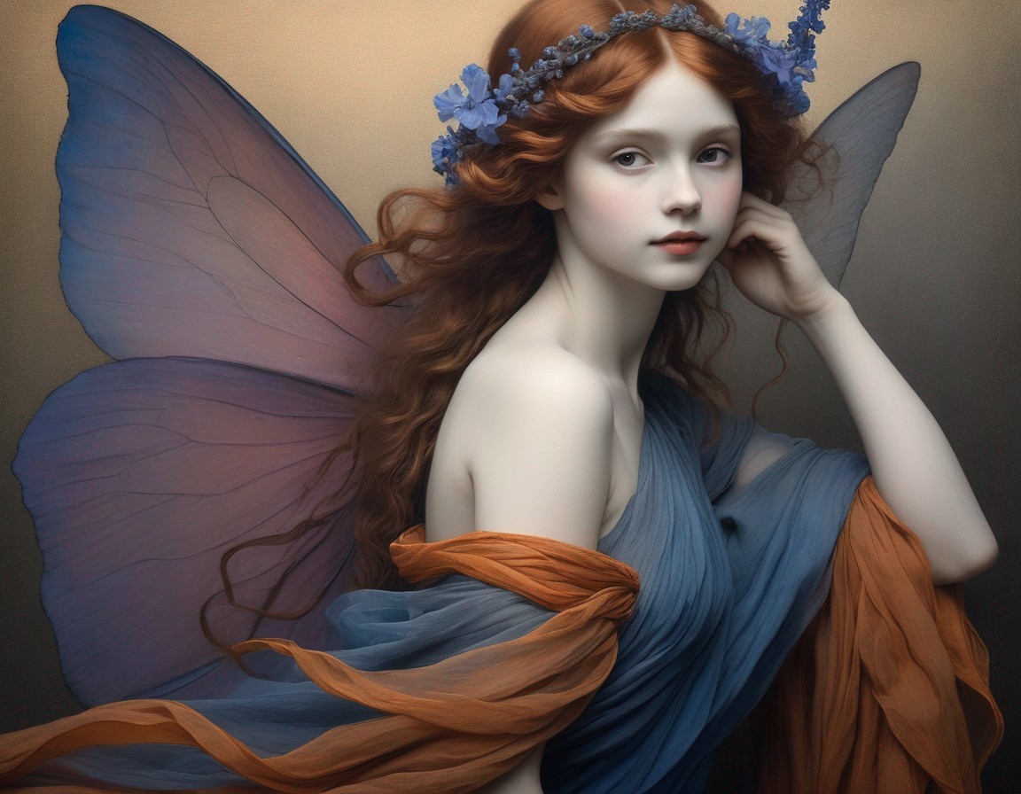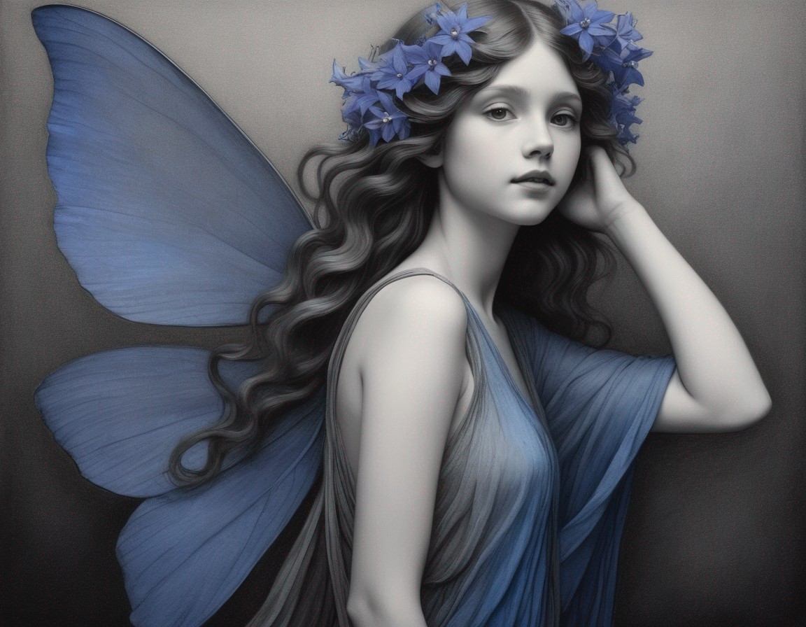 An illustration of a woman with blue butterfly wings, a floral wreath on her head, and long flowing hair, exuding a mystical aura.