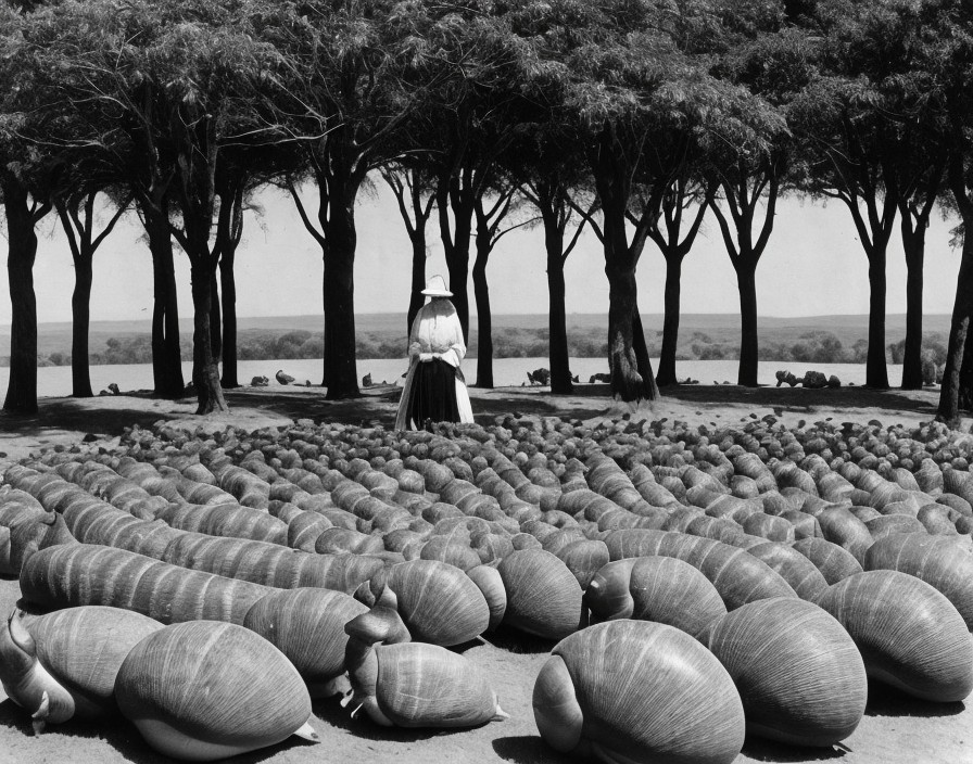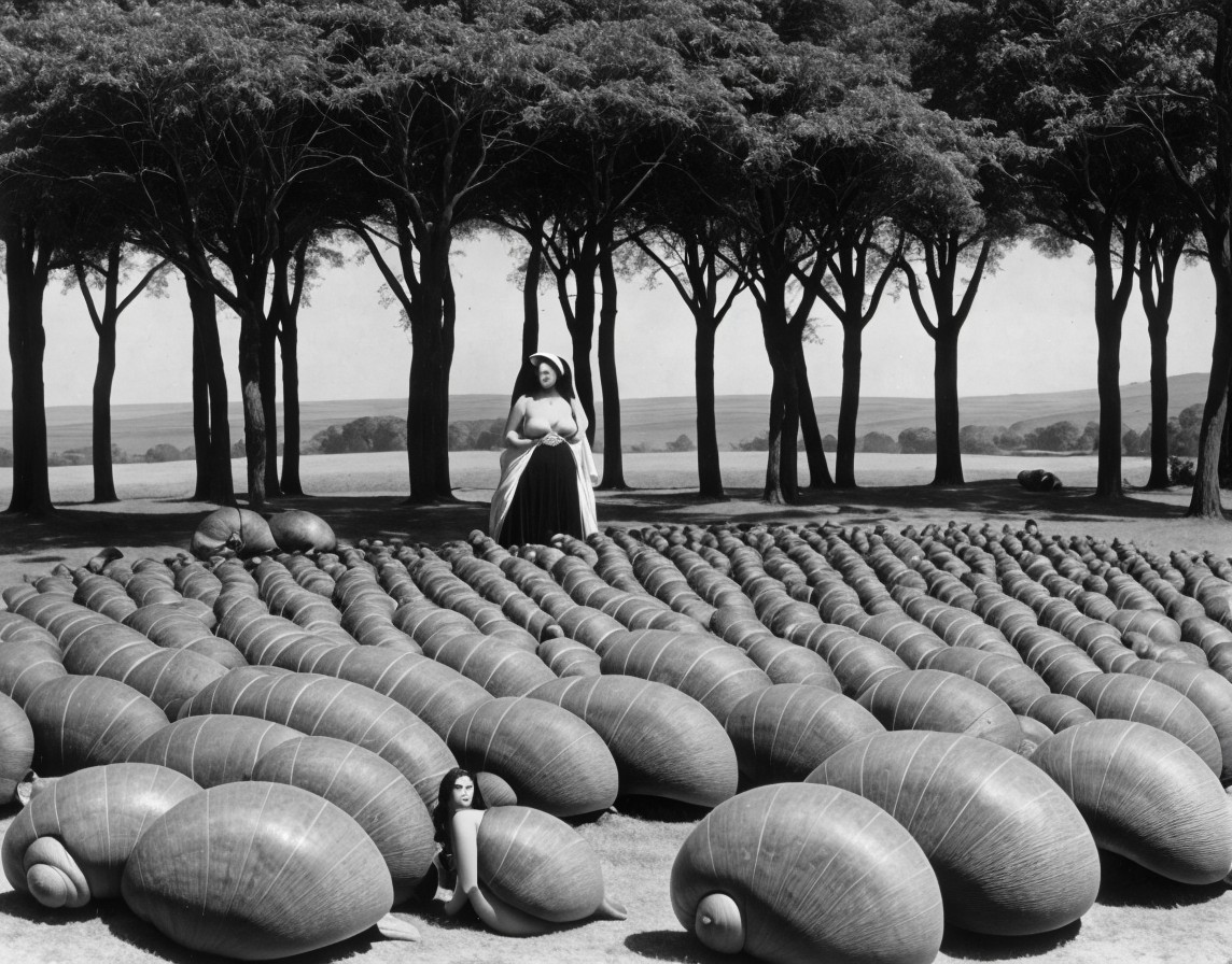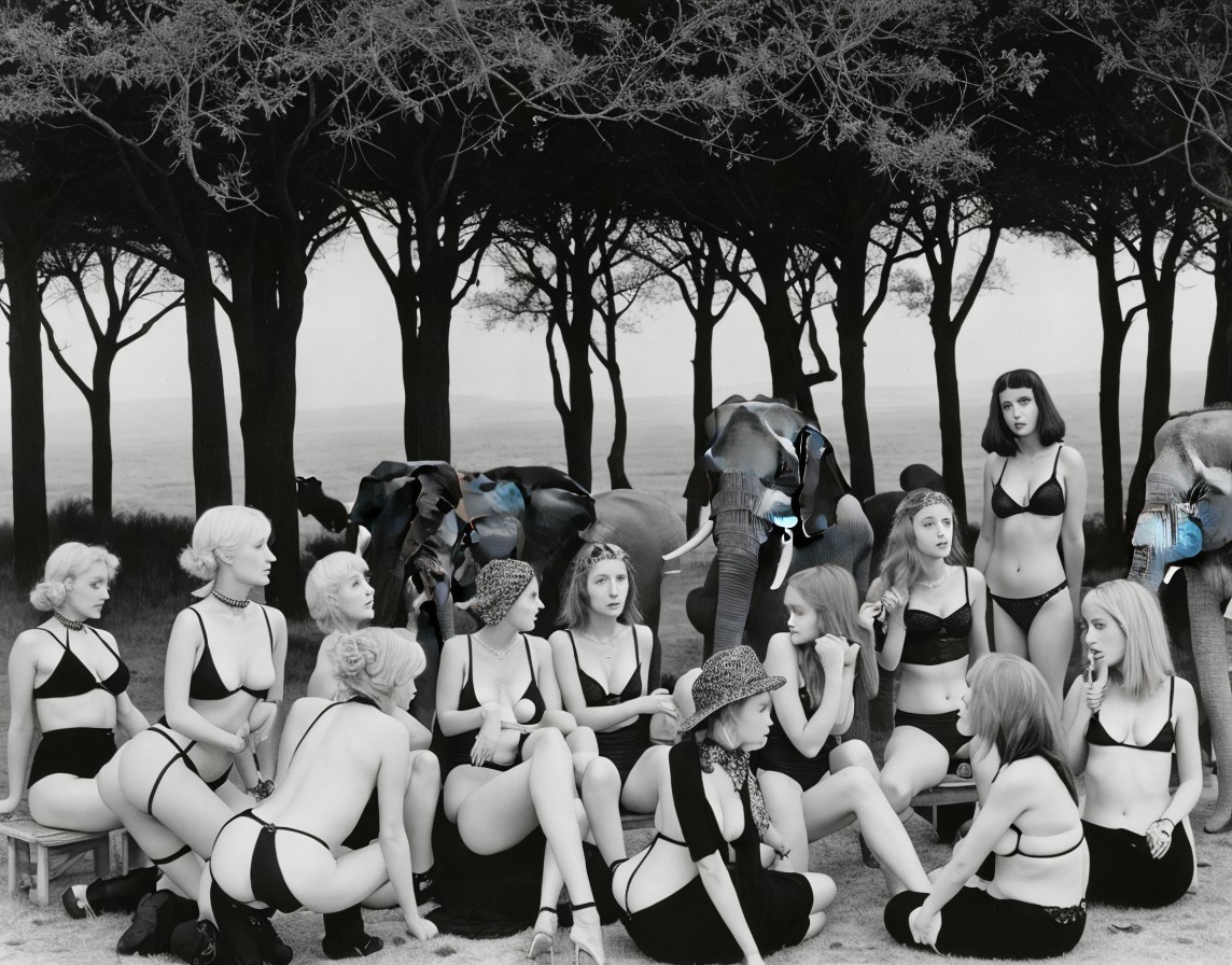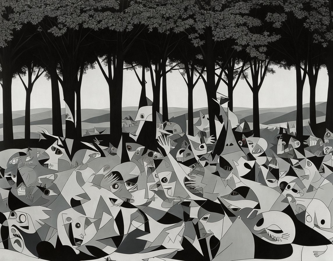 A group of figures with skull-like masks and vests sits in a misty, eerie forest setting, evoking a macabre or surreal atmosphere.