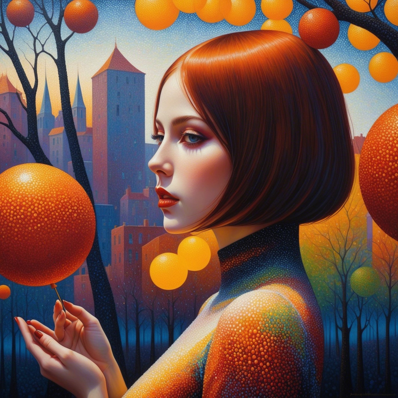 In a vibrant, dreamlike scene, a young woman with auburn hair gazes thoughtfully into the distance. Spheres in rich orange hues float around her, contrasting with the background of tall, spired buildings bathed in autumnal twilight. The artwork blends surrealism with pointillist precision.