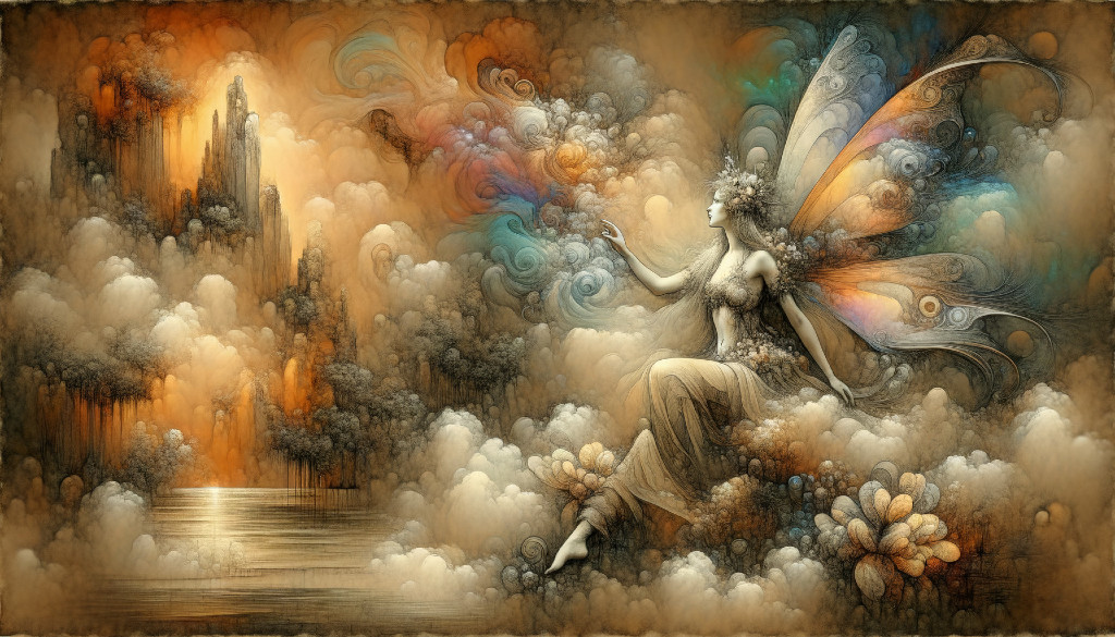 Detailed charcoal drawing of a fairy lady on a heavenly island with vibrant colors and a matte background. Features include light reflection, transparency, Chinese watercolor, and a soft mist effect. The artwork also incorporates a sepia effect, pen and ink sketch, blue and orange watercolors, and elements of Botticelli's style.
