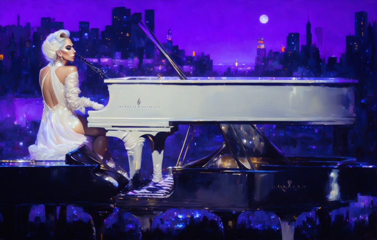 Prompt: Oil painting of Lady Gaga in a serene and captivating scene. She is gracefully playing a piano on a rooftop against the backdrop of the night sky and illuminated solitaires, with the city lights twinkling below. Heavy brush strokes and paint splashes by Jeremy Mann, Carne Griffiths, and Robert Oxley. Rich and deep colours. Award winning, professional, intricate details. Volumetric lighting, gorgeous masterpiece, sharp focus, dof, 8k.