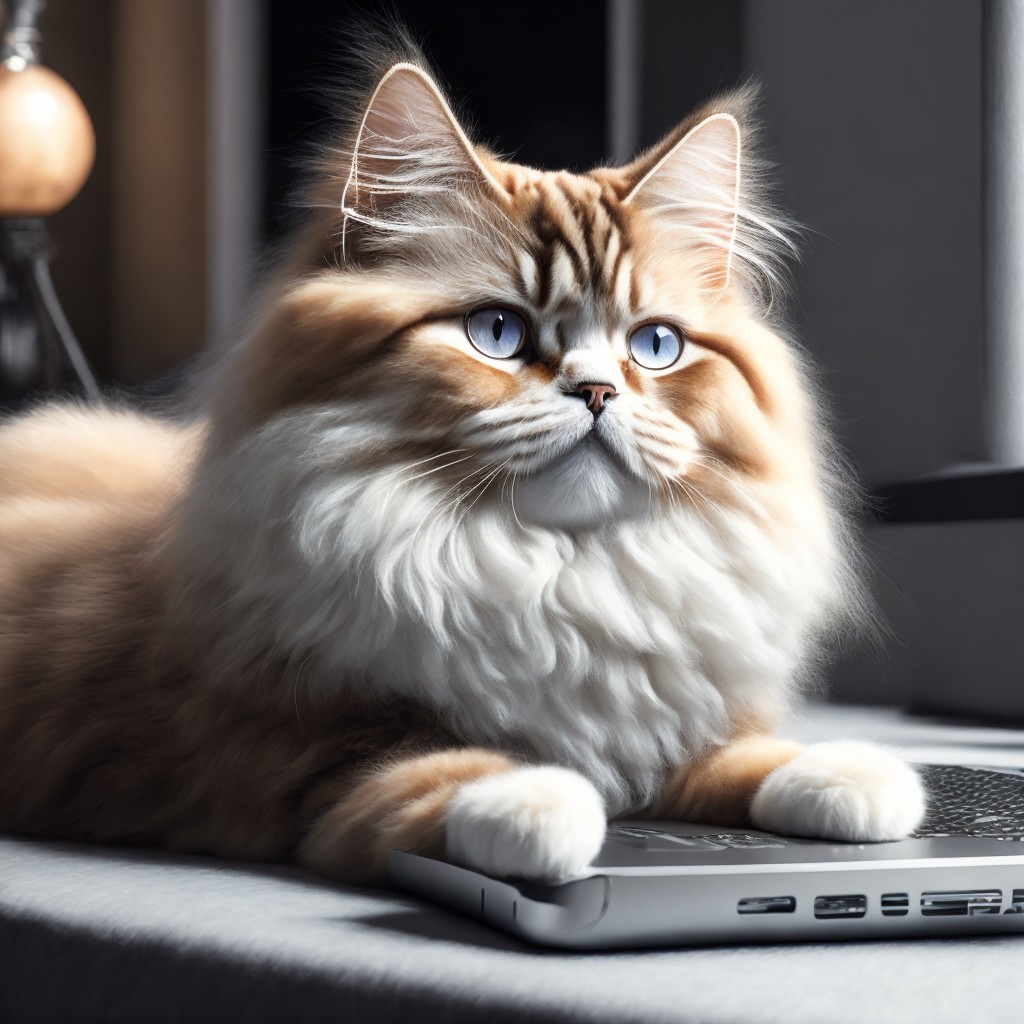 A fluffy, golden-brown cat with striking green eyes is resting its paws on a laptop. The cozy atmosphere features soft lighting and stylish home decor in the background.