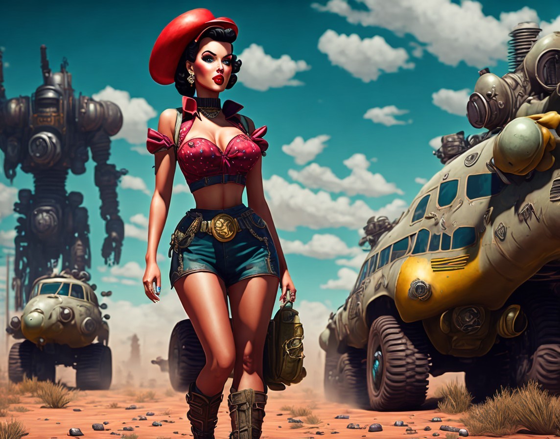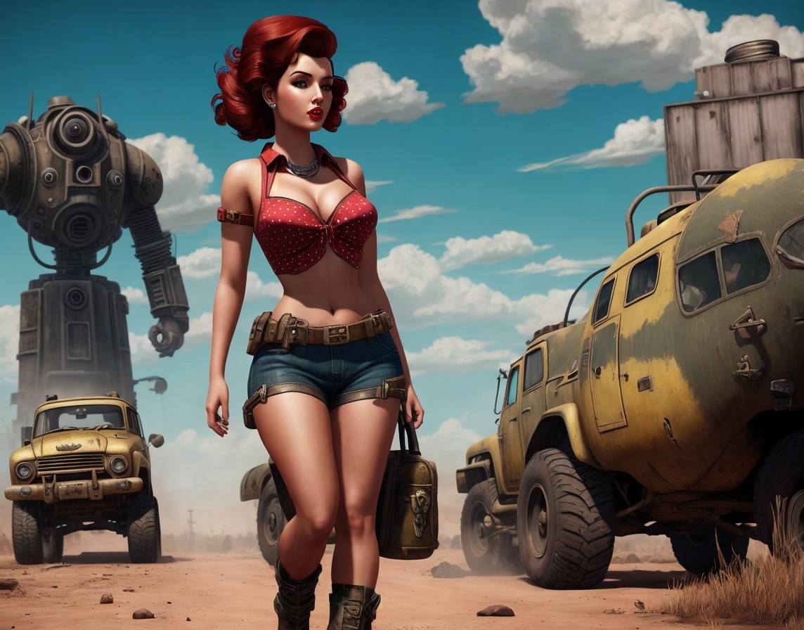 Stylized female character in post-apocalyptic setting with robot and deteriorated vehicles