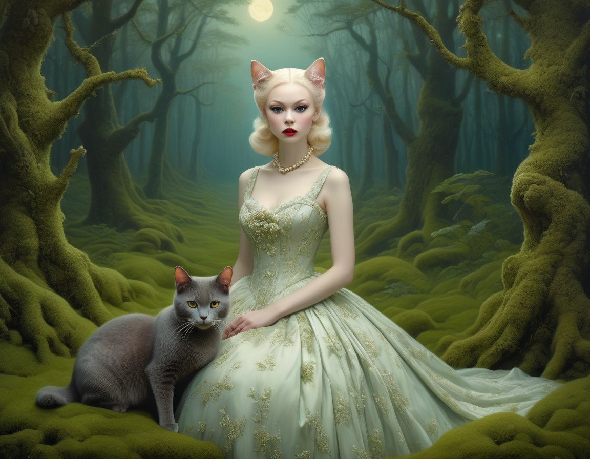 Prompt: "oil painting , luminism ,portrait of a beautiful ethereal eccentric little girl (( slightly smiling )) camouflaged as a cat , moonlight ,wildwood , forest ,nature , moss , grass growing everywhere , by mark ryden, natalie shau , michael sowa , low Brow Art ,contemporary high fashion dress designed by Galliano , Gaultier , pastel colors , colorful background , summer , paisley patterns , fairytale evil shadows , moody , enchanting , surreal, botanical elements , fibonacci , powder blue , green , black , gold , mysterious , intricate details , high definition , photorealistic , extravagant , wind , illuminated , dramatic lighting, soft , smooth"