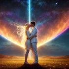 Couple Kissing in Cosmic Field with Heart-Shaped Colors