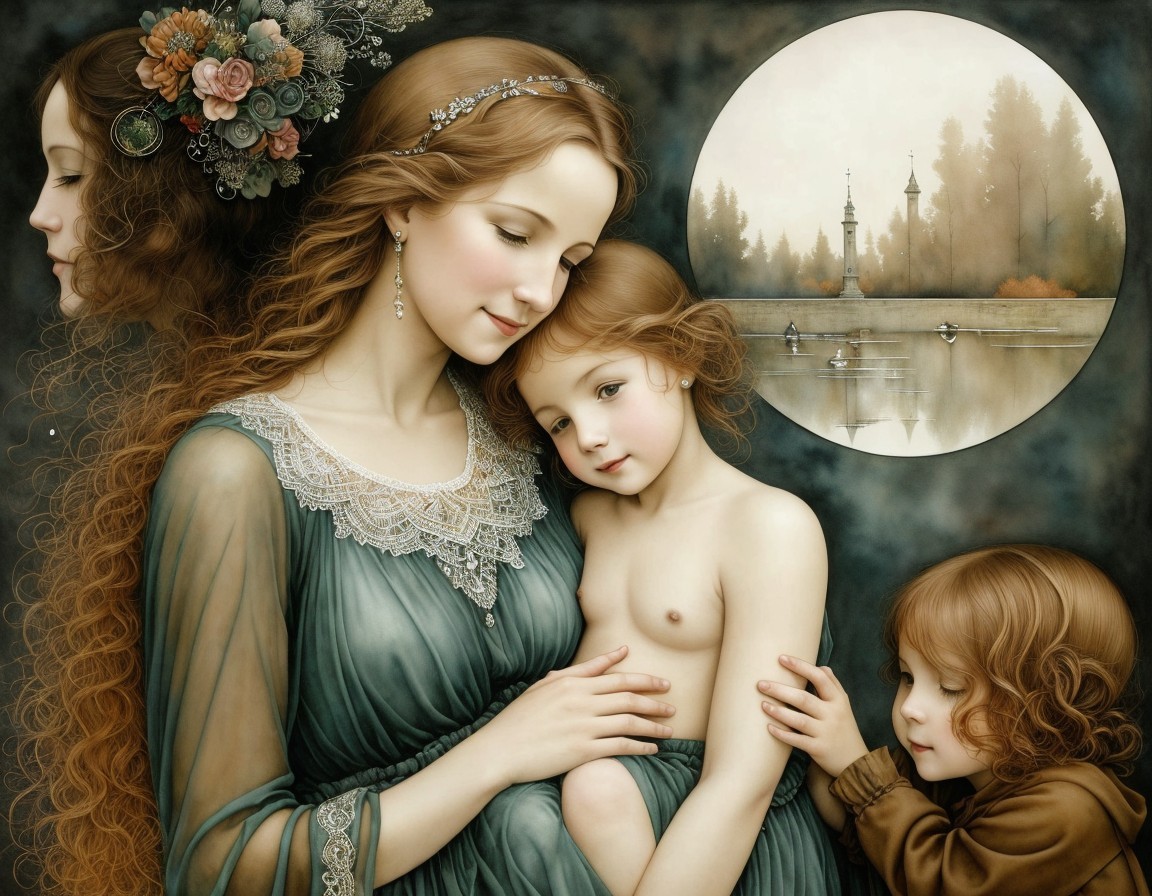 A serene portrait of a mother embracing her sleeping child, with another child looking on. Neutral tones, celestial motifs, and water body in the background.