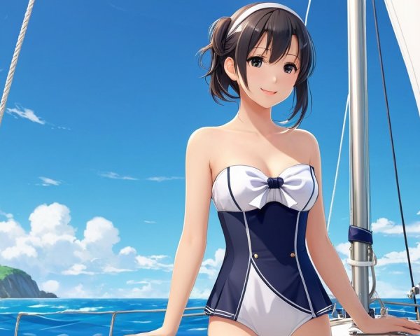 A charming anime character dons a vibrant azure strapless swimsuit, exuding a playful and cheerful vibe. Her bright eyes and lively expression capture the essence of summer fun and adventure.