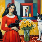 A woman in a vibrant red dress holds a bouquet of flowers, flanked by black cats. The background features colorful patterns and floral motifs, creating a whimsical, lively atmosphere.