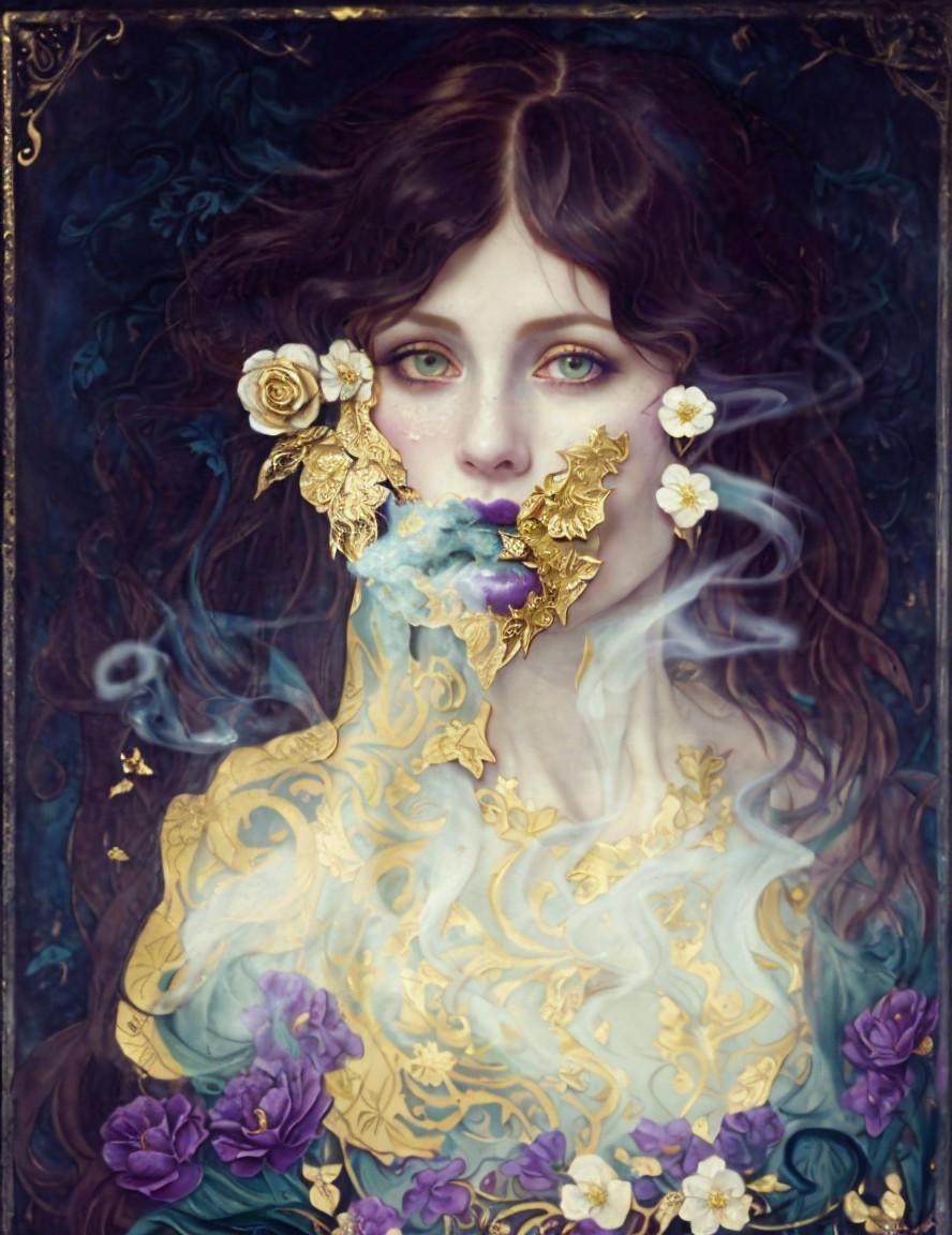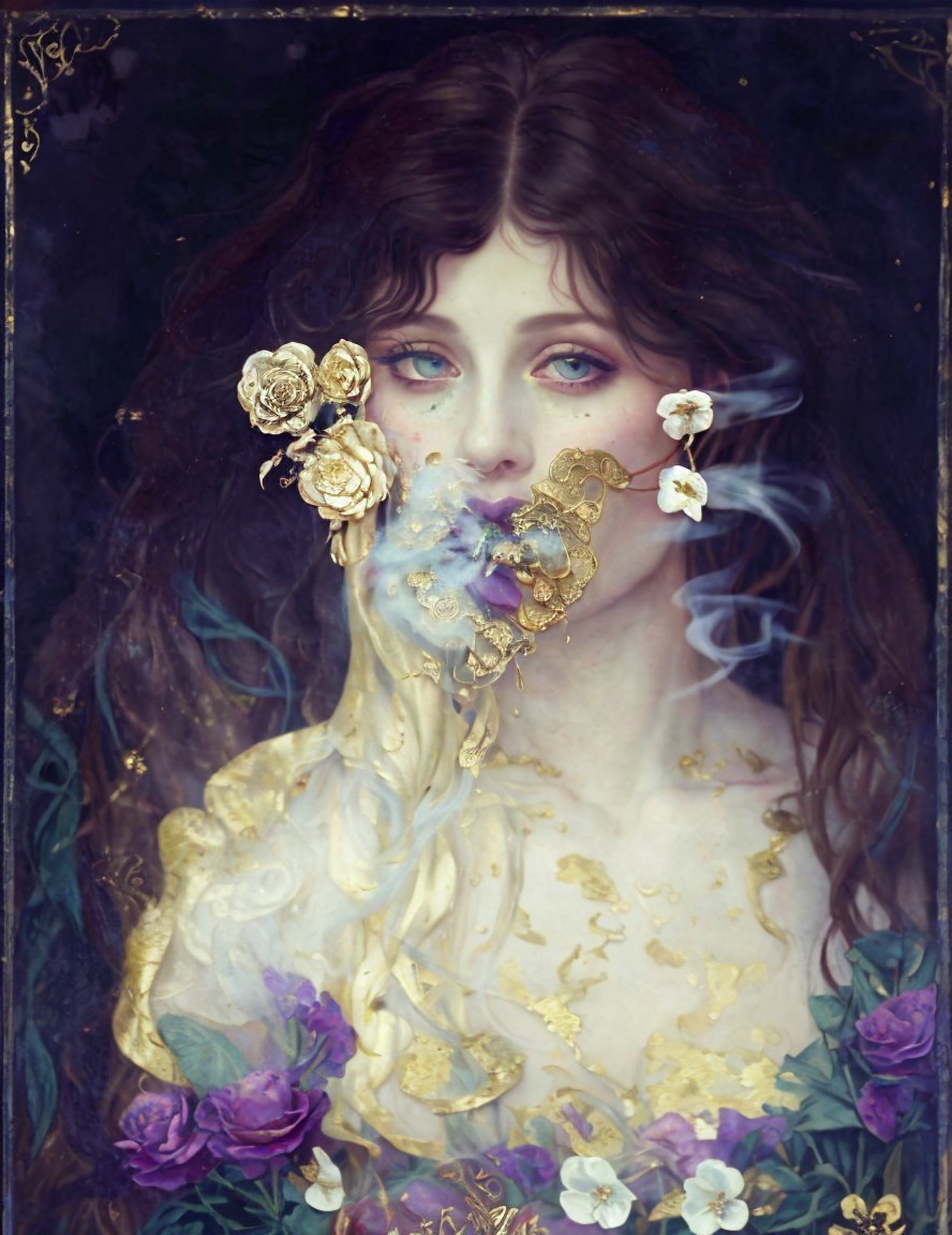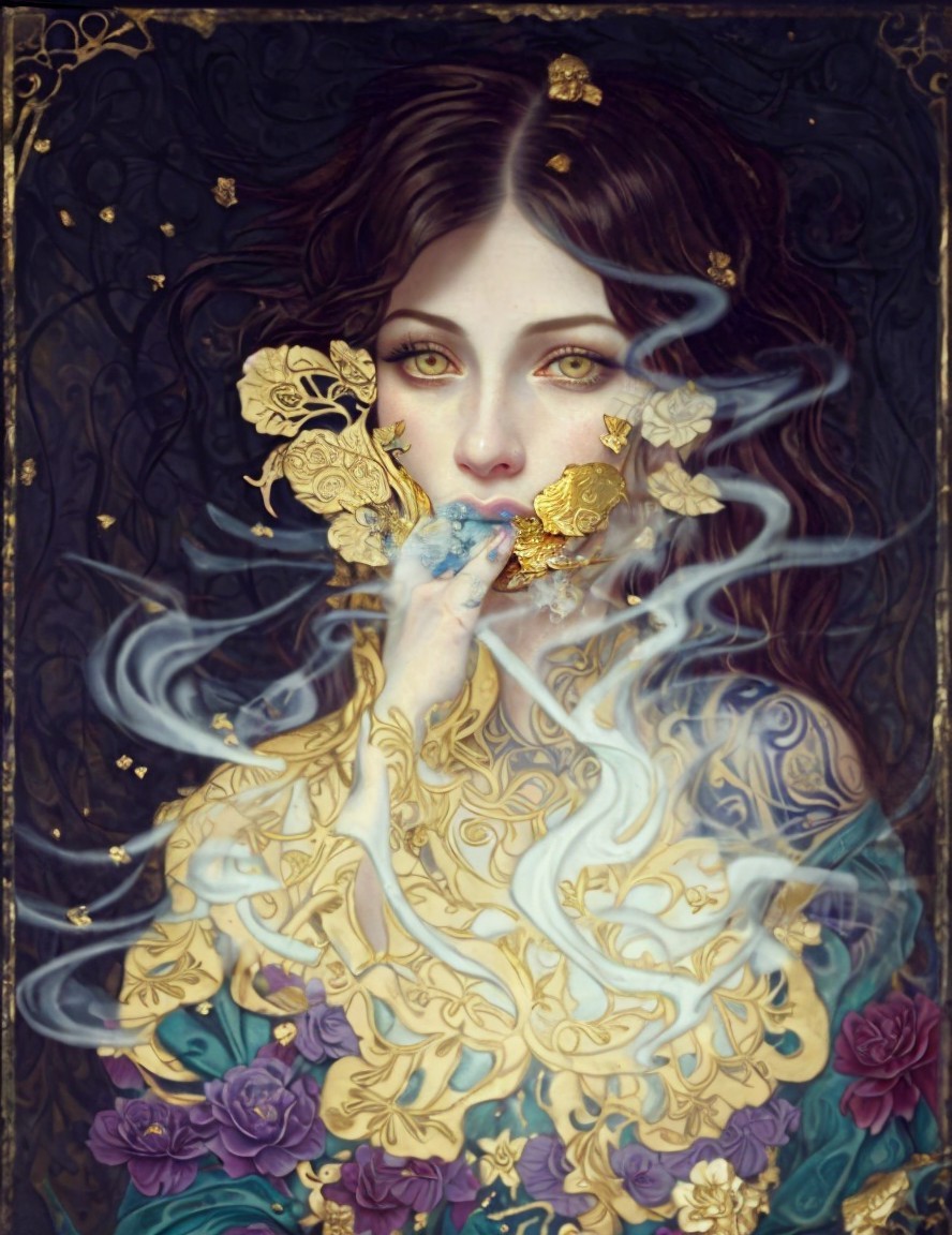 A surreal portrait of a woman with gold accents, tattoos, and smoke swirling around, set against a dark, ornate background.