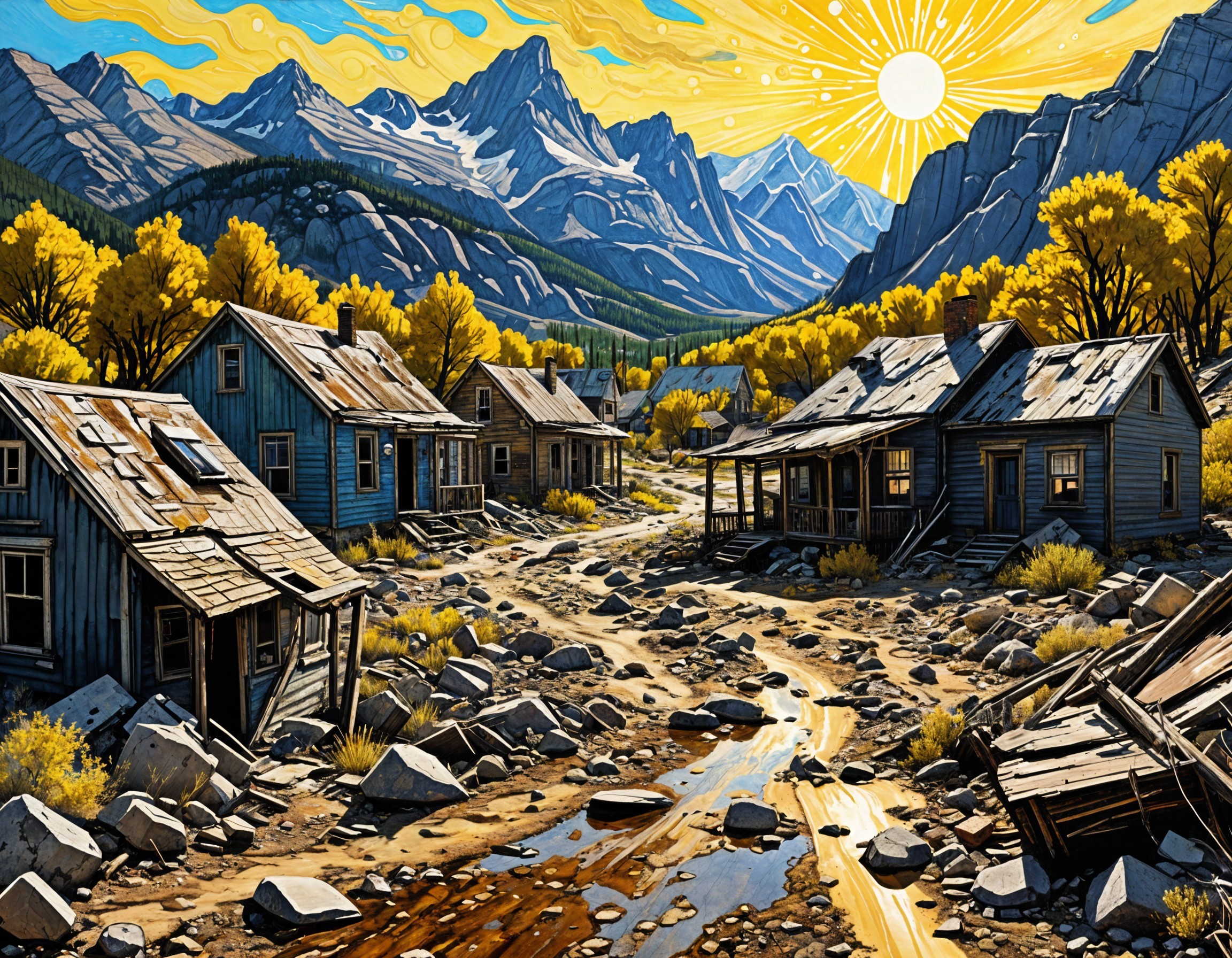 A vibrant landscape features dilapidated wooden houses amid a rugged mountain backdrop. Golden sunlight bathes the scene, highlighting the rocky terrain and a meandering stream.