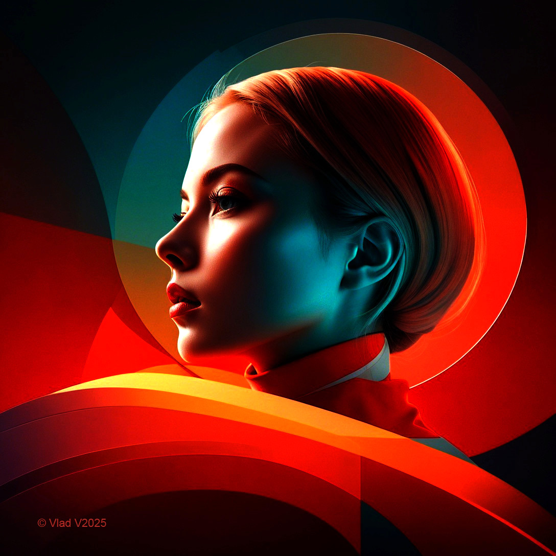 A striking profile of a woman against a vibrant backdrop of bold colors and abstract shapes. The interplay of light and shadow creates a captivating, modern aesthetic.