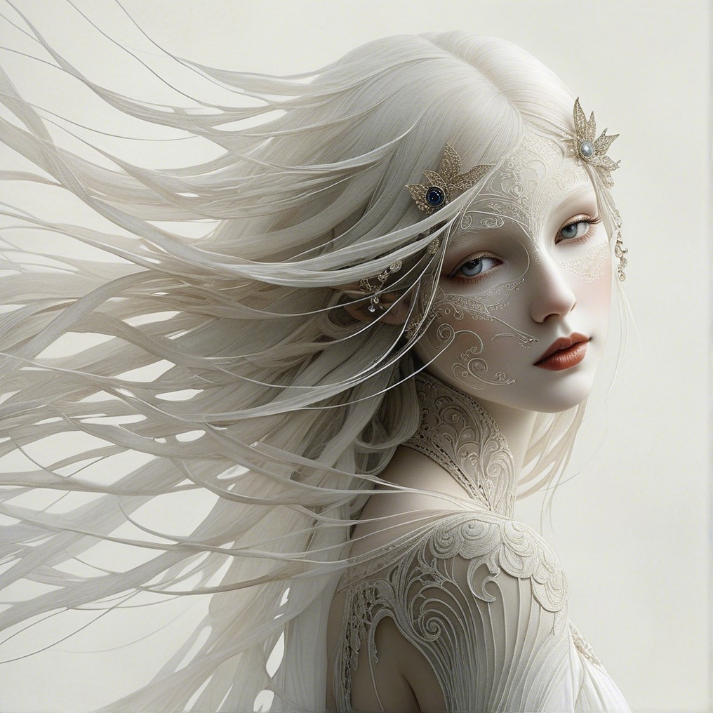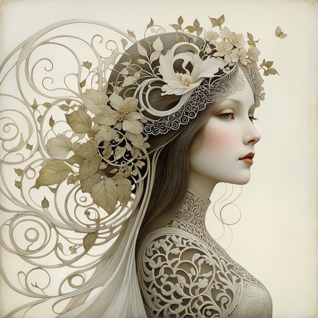The image features an elegant woman with intricate, curly hair adorned with a butterfly. She wears a beautifully detailed necklace and has a serene expression against a swirling, ornate background.