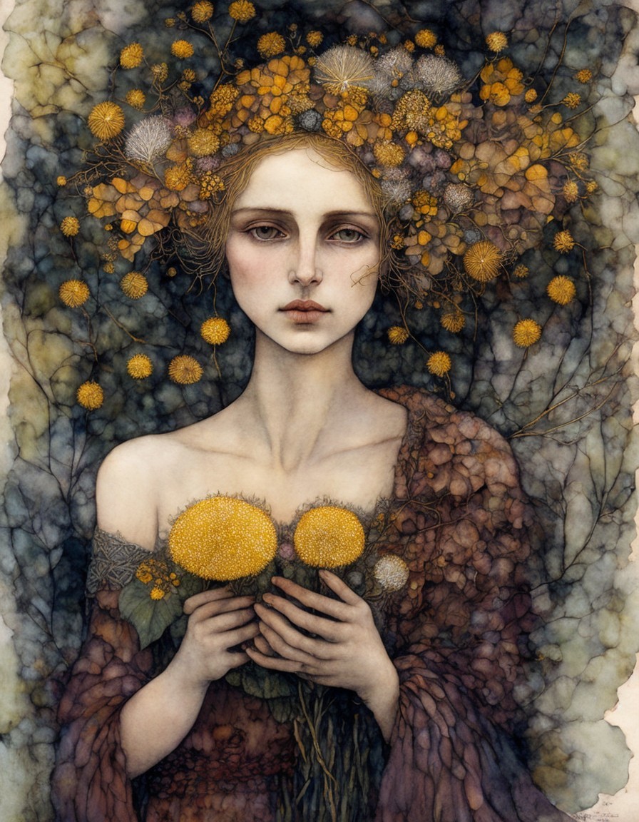 Beautiful woman with a dandelion hat, portrait in ochre, patina of ancient stone with moss, art brut, moody, somber, desaturated colors, in the style of Paul Klee, Arthur Rackham