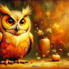 A vibrant, stylized owl with striking orange and brown feathers sits among autumn-themed decor, including colorful flowers, pumpkins, and decorative vases, creating a warm, seasonal atmosphere.