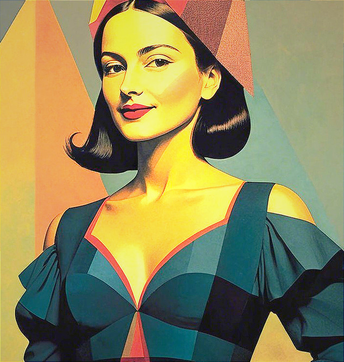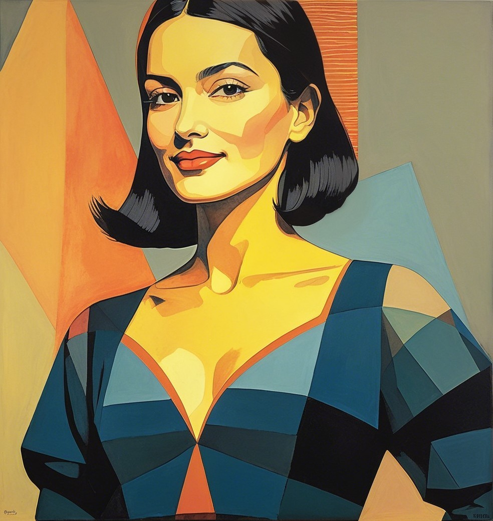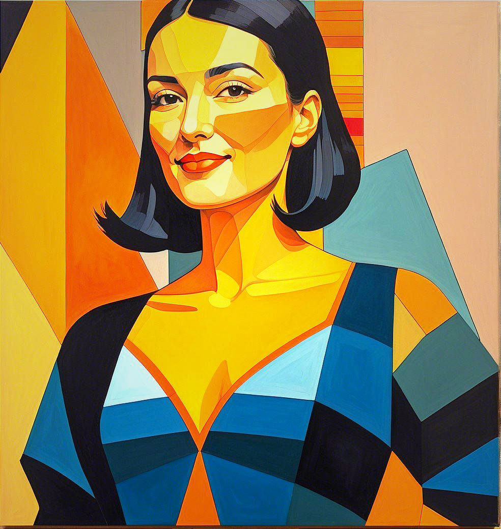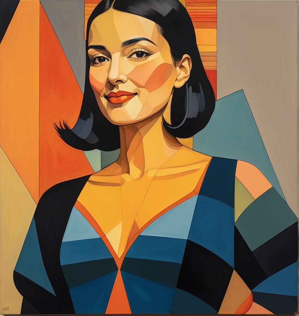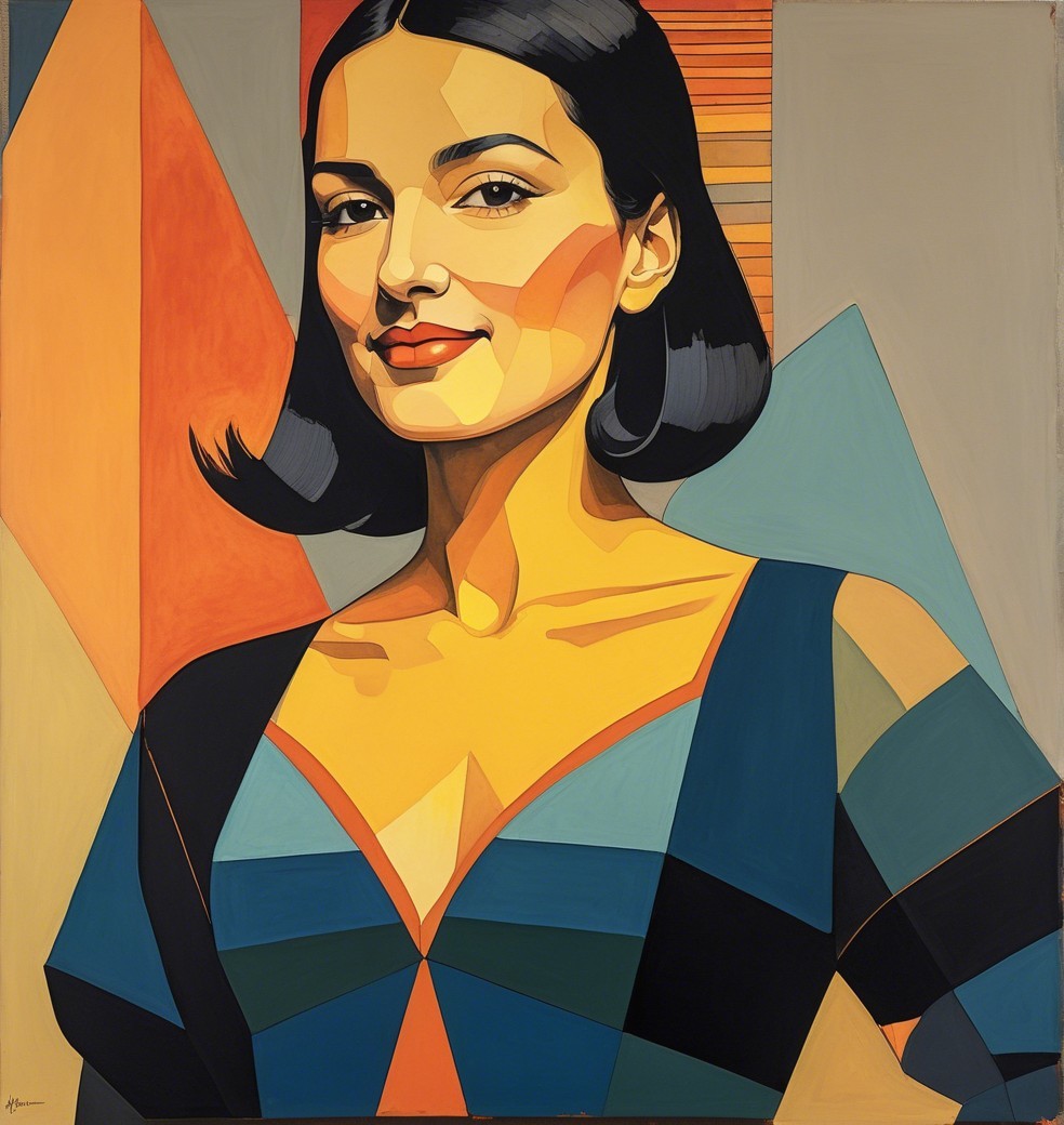 Intricate portrait featuring wavery coloring, black-haired bobcut, dry ink brush outlines, reminiscent of Georgia O'Keeffe's style with a figurative touch inspired by Paul Klee and Lyonel Feininger, dyed cubist reminiscence by Man Ray, beautiful line-art, indiecore details, smirky smile, tetradic color scheme burnt-orange umbra currant-red goldenrut-yellow, metallic-honey accents, wavery dappled lighting, zentangle, mosaic with hatching influences, color hues by Overton Loyd and Ho baron, extreme variety of colors, slightly sculpted, flowing hair illusion, ethereal atmosphere, harmony, liminal, luminism, plasticity 1.6, dynamic lighting, hues by Ho baron, lighting by Ed Paschke, wavery texture patchwork, pellucid details, juminocore elements, grunge, fusion art, precise Gelsculpt 64K, novelty architecture, stylized chipped patchwork, warm pastel color palette,headshot, precise Gelsculpt 64K rendering, cel-shaded drawing style, novelty architecture, dof, bokeh, debeh, negative lucas numbers, merged styles of Naoto Hattori & Renny Tait, detailed line-art with geometrical precision, utilizing hues by Ho Baron for an effusive color palette. Ensure smooth, brightness, joyful 3 point lighting, consistent lines for a coherent and nuanced composition, illuminated by dappled lighting, tesselated, stippled, blotted textures for a touch 1970's vintage cartoon aesthetics, parallax occlusion effects. Embrace a patchwork and mosaic approach for a unique and visually captivating artwork. stippled shadow effects, visible textures, creating a coherent line-artwork by david graeme Baker and Marc Allante, novelty architecture, dethereal, chibli, coherent line-art features, multi-layered eyes, serenity, joyful, gradient inking watercolors, asymmentrical geometric lines, line-art, HDR, crisp quality, American Gothic merged with comic book art. Maximalism, rule of thirds, ambient occlusion 1.3, warm coloring, brightness 1.3, parallax occlusion 1.3,