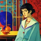 A woman in a turquoise outfit sits beside an easel displaying a colorful portrait of a blue-skinned figure with vibrant hair. The setting features various artistic tools and a creative atmosphere.
